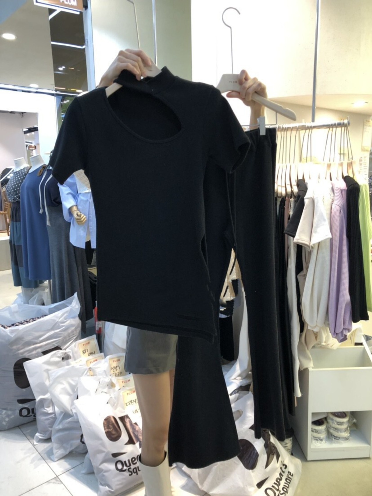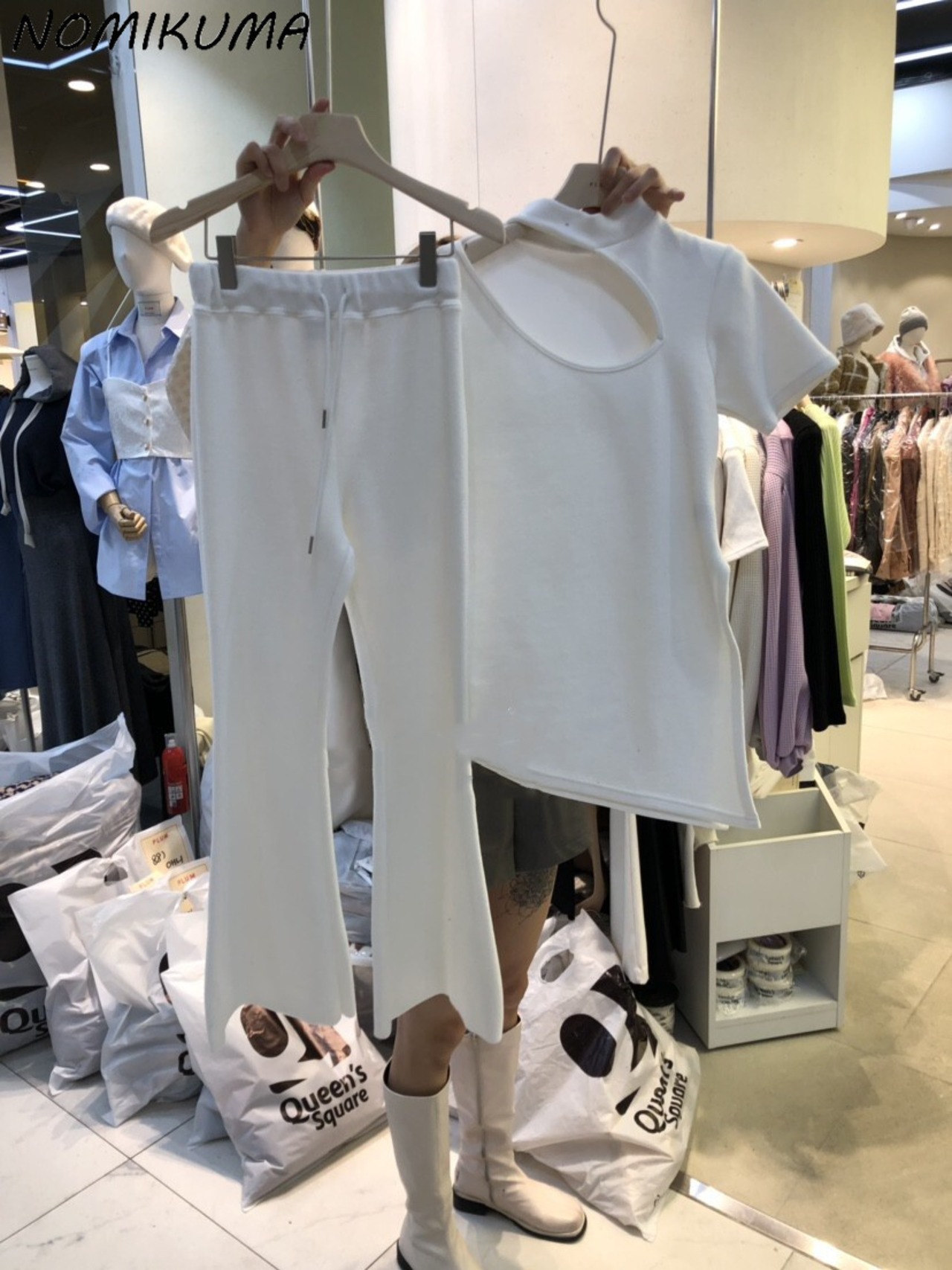 ノミクマサマーツーピースセットレディースホローアウトOネック半袖スプリットトップ+レースアップウエストフレアロングパンツスーツ ショート ハーフスリーブ 夏物 kor28767869678