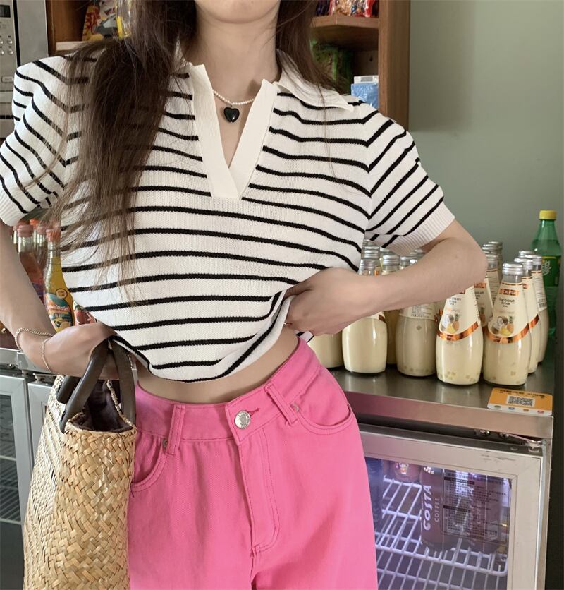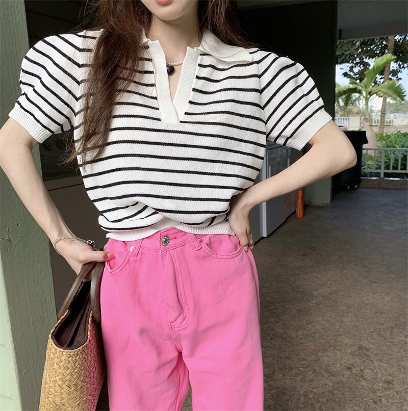 ノミクマストライプパフスリーブニットカジュアルターンダウンカラープルオーバートップス2022夏の女性ニットセーター サマー 夏物 kor62542605785