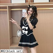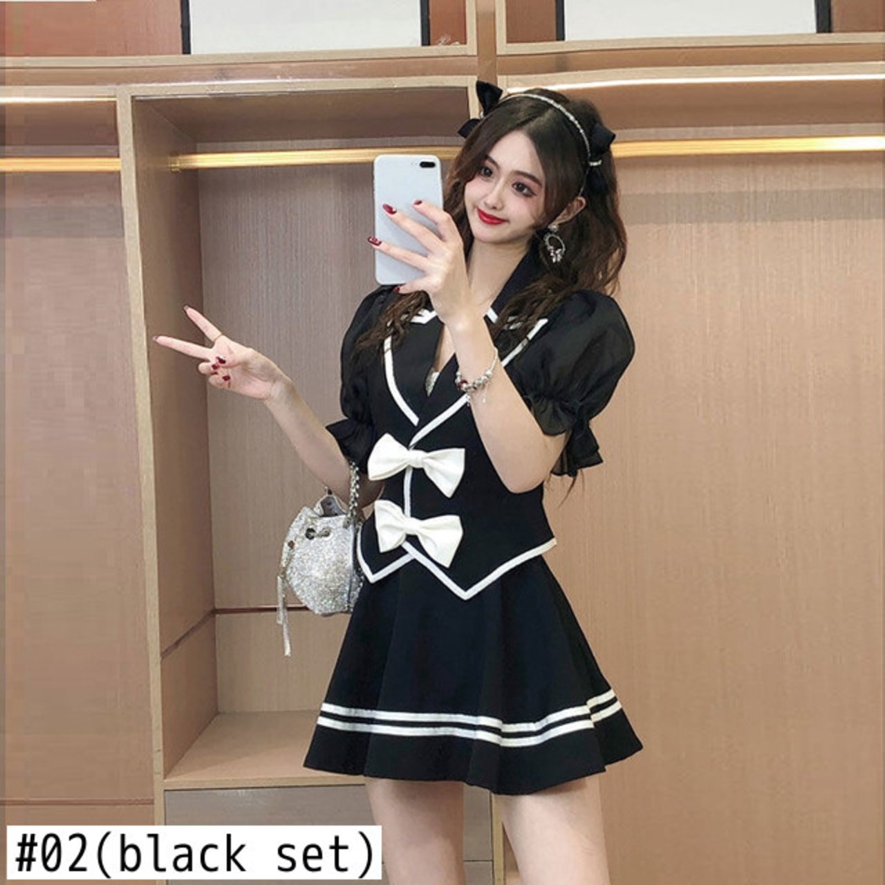のみくま2点セットレディースシックボウノットパフスリーブノッチカラートップ+ウエストAラインスカートスーツサマースーツ リボン 夏物 kor17459692182