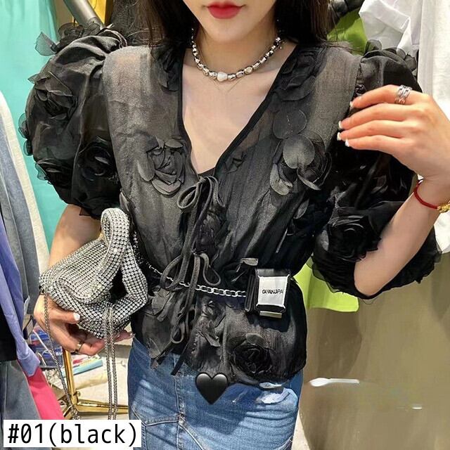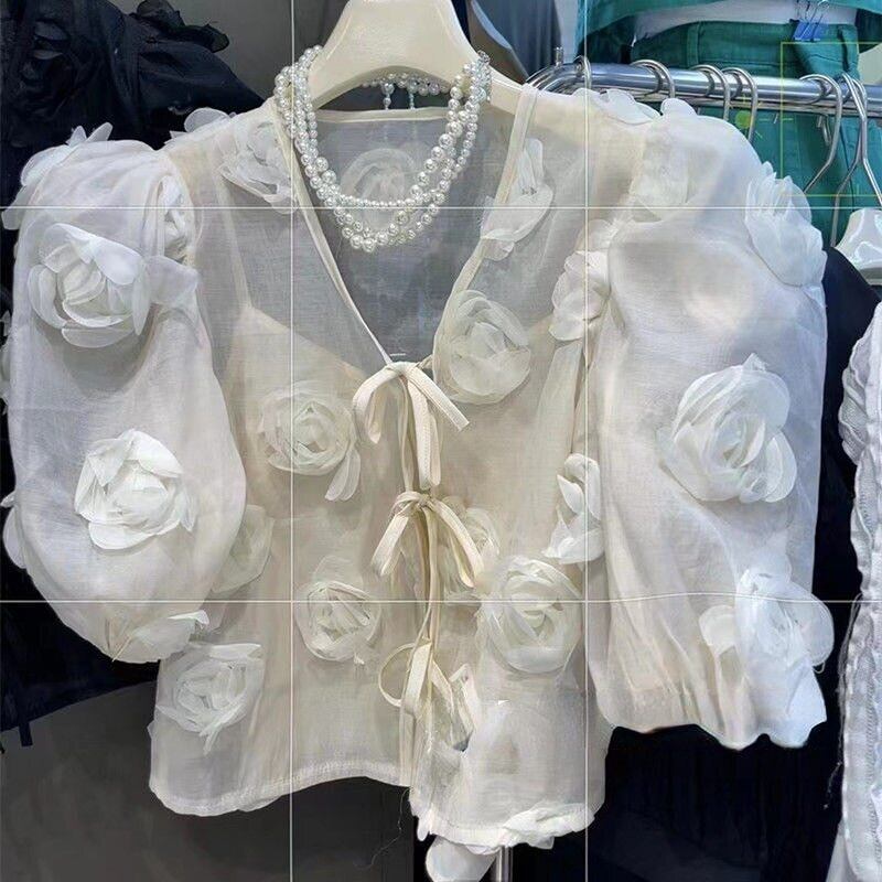 ノミクマローズフラワーカーディガンツーピースレディース2022サマーソリッドスリングベスト+パフスリーブVネックレースアップブラウスコート 夏物 ソリッドカラー フラワーデザイン kor63483498329