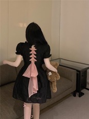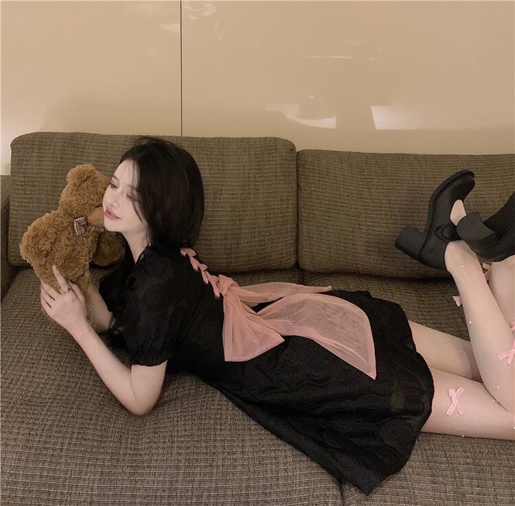 のみくまウーマンドレス2022サマーパフスリーブOネックVestidosボウ包帯ウエストAラインスウィートミニドレス リボン 大人ガーリー キュート カジュアル 夏物 kor60300444410