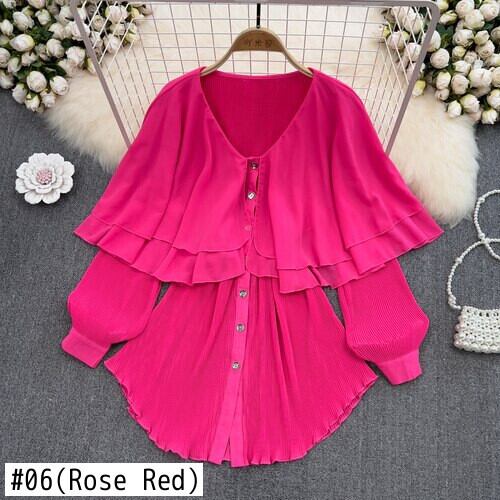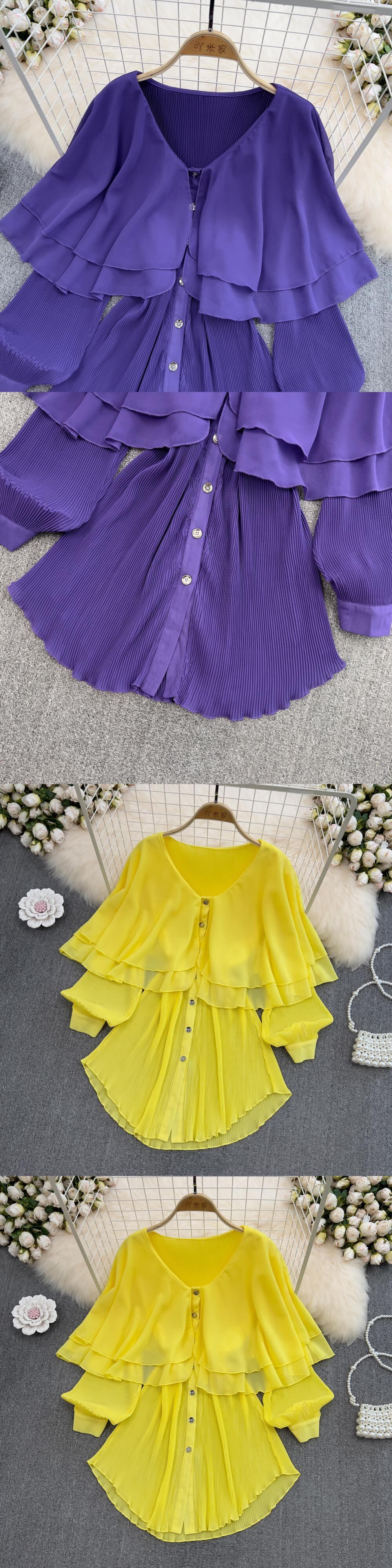 ノミクマVネックフリルシフォンブラウスフォールドミディアムロングシャツ2022サマーロングスリーブレディーストップス 長袖 夏物 kor26684864288