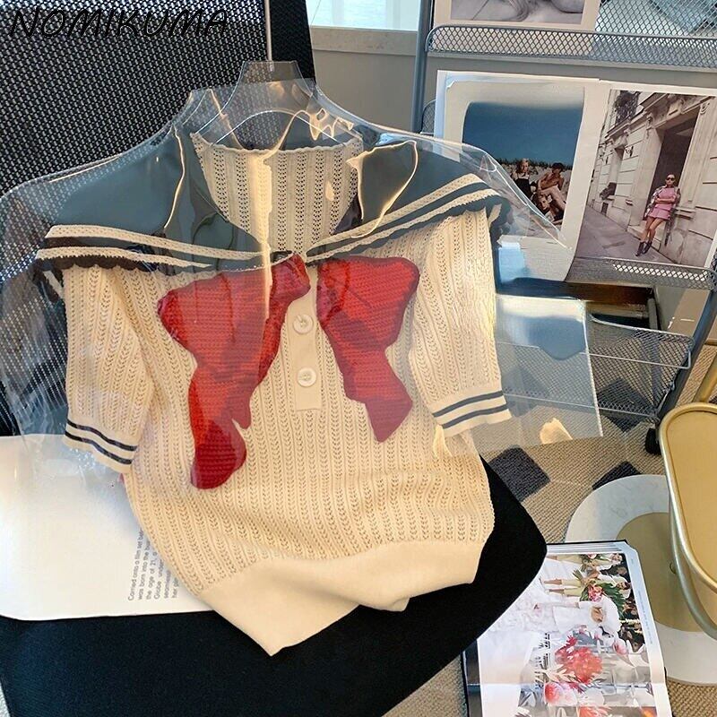 ノミクマスウィートボウノットセーラーカラーニットウェアコーザルパフスリーブレディースセーター2022サマーホローアウトニットプルオーバー リボン 大人ガーリー キュート カジュアル 夏物 kor22246697485