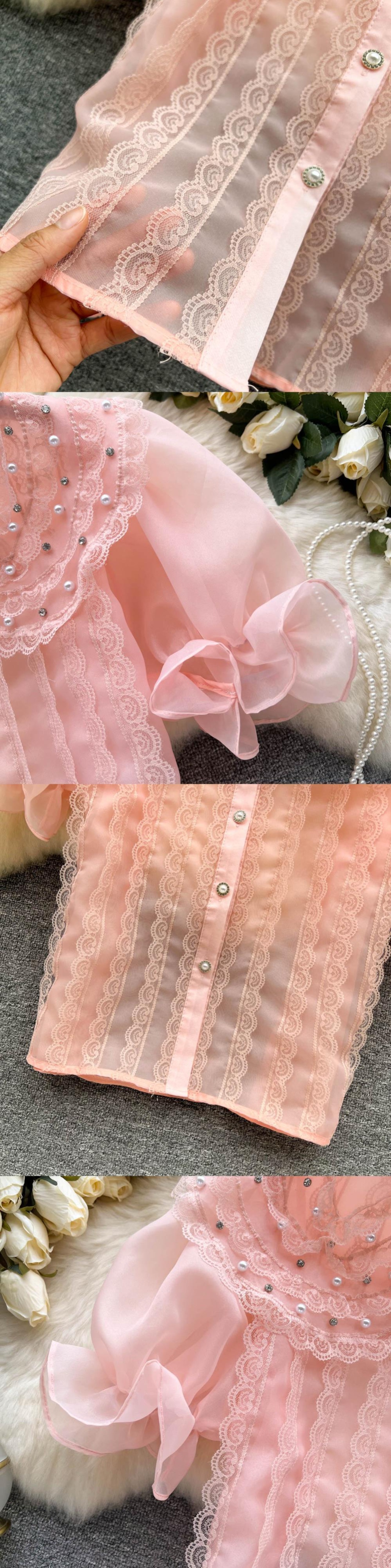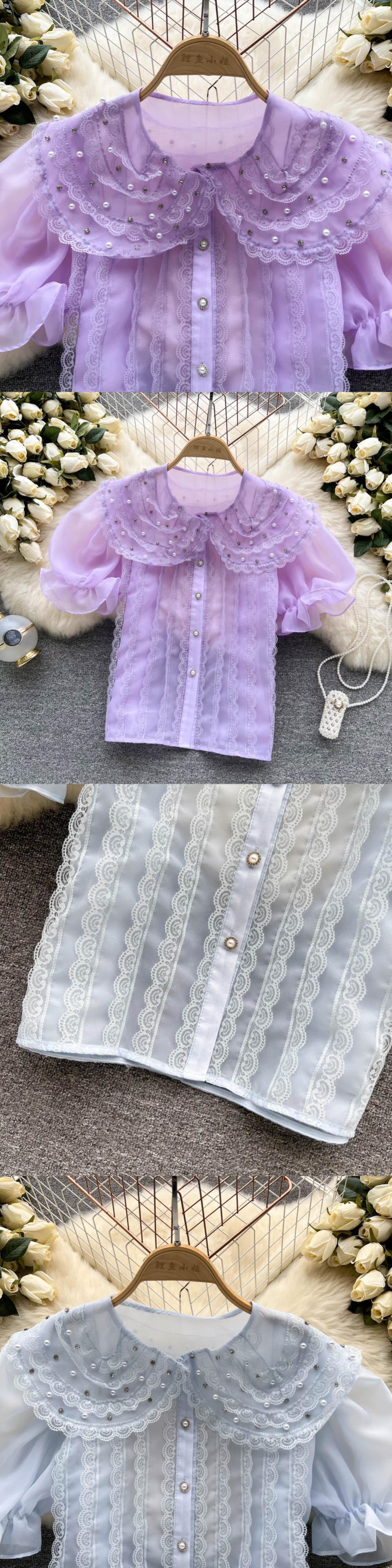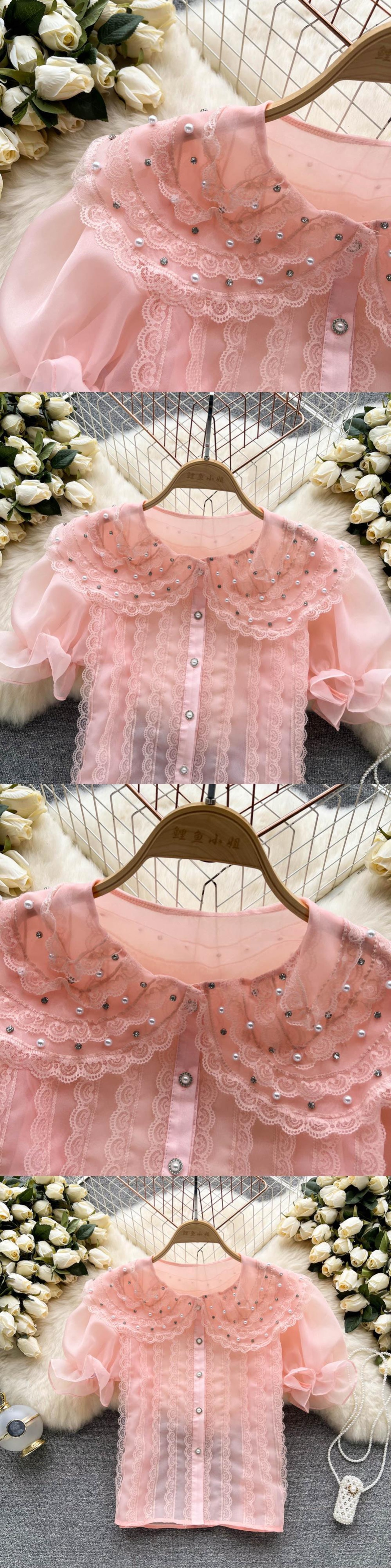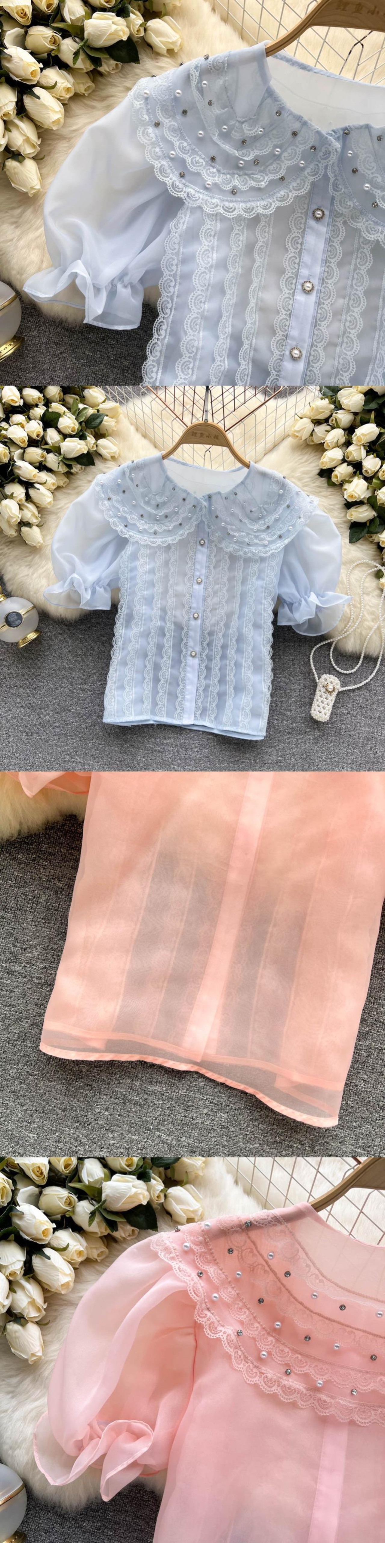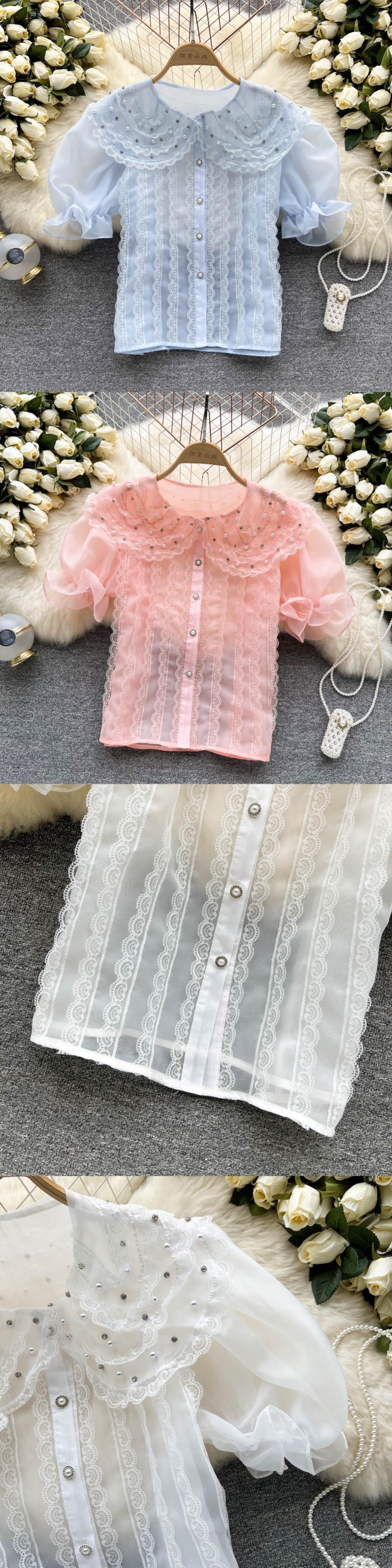 のみくまシックビーズガーゼウーマンシャツレースパッチワークパフスリーブピーターパンカラーブラウス2022夏 サマー 夏物 kor77062084718