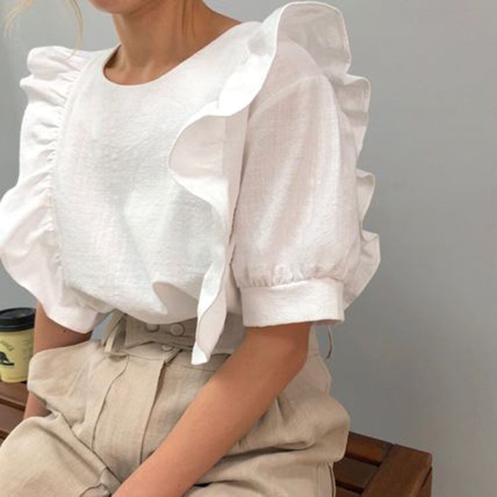 のみくまシックフリルパッチワークレディースブラウスランタンスリーブOネックトップ2022サマースウィートソリッドシャツ 大人ガーリー キュート カジュアル 夏物 ソリッドカラー kor24481095388