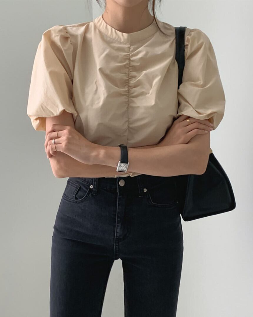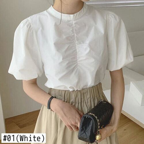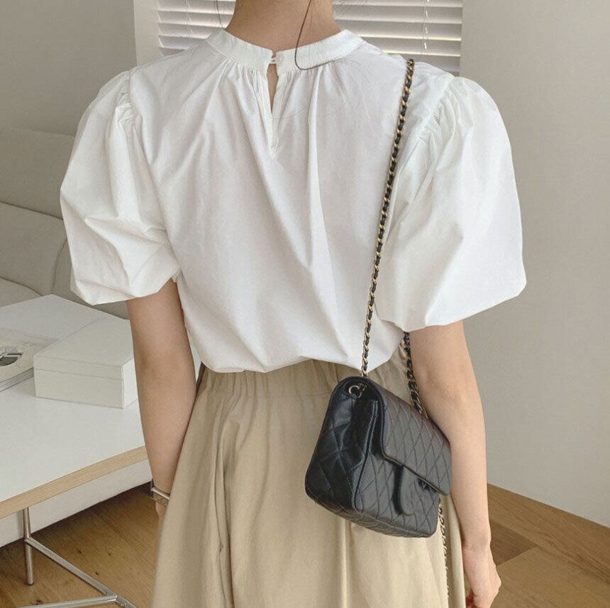 ノミクマシックフォールドスタンドネックパフスリーブブラウスシャツサマーソリッドレディーストップ2022スタイルフェミニマ 夏物 ソリッドカラー kor28607633069