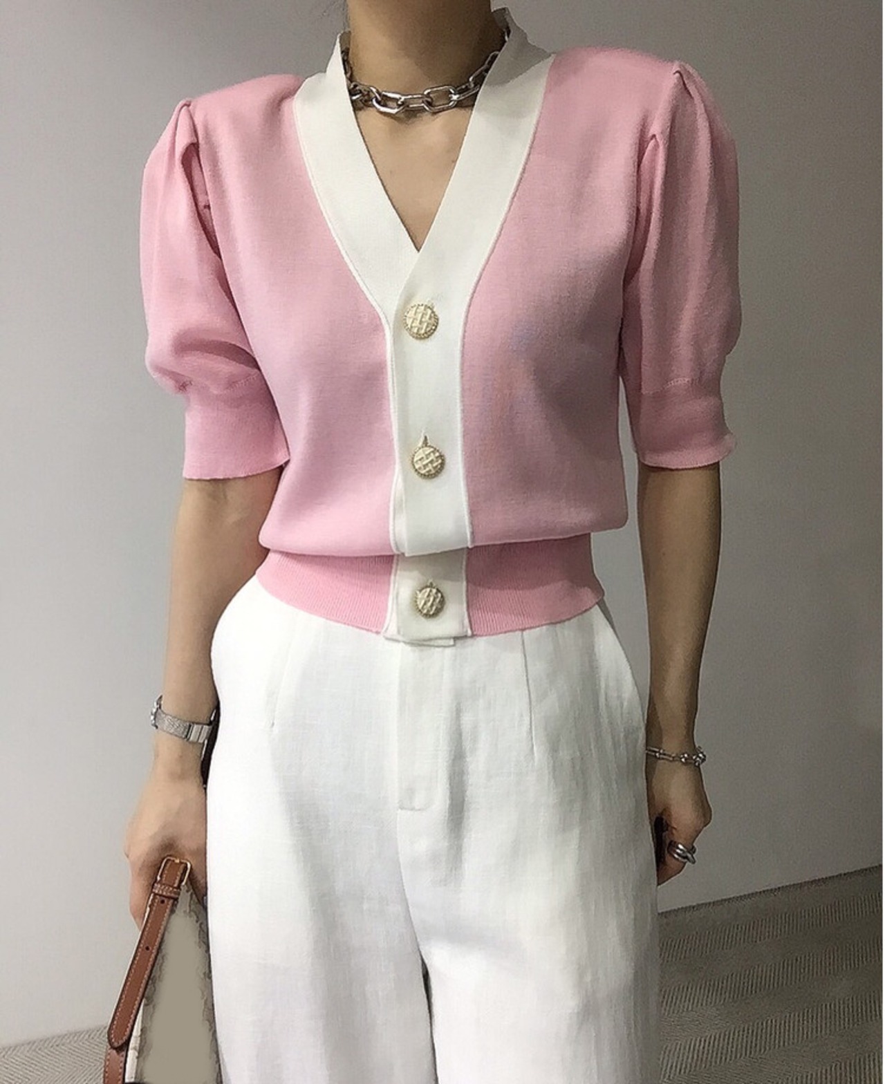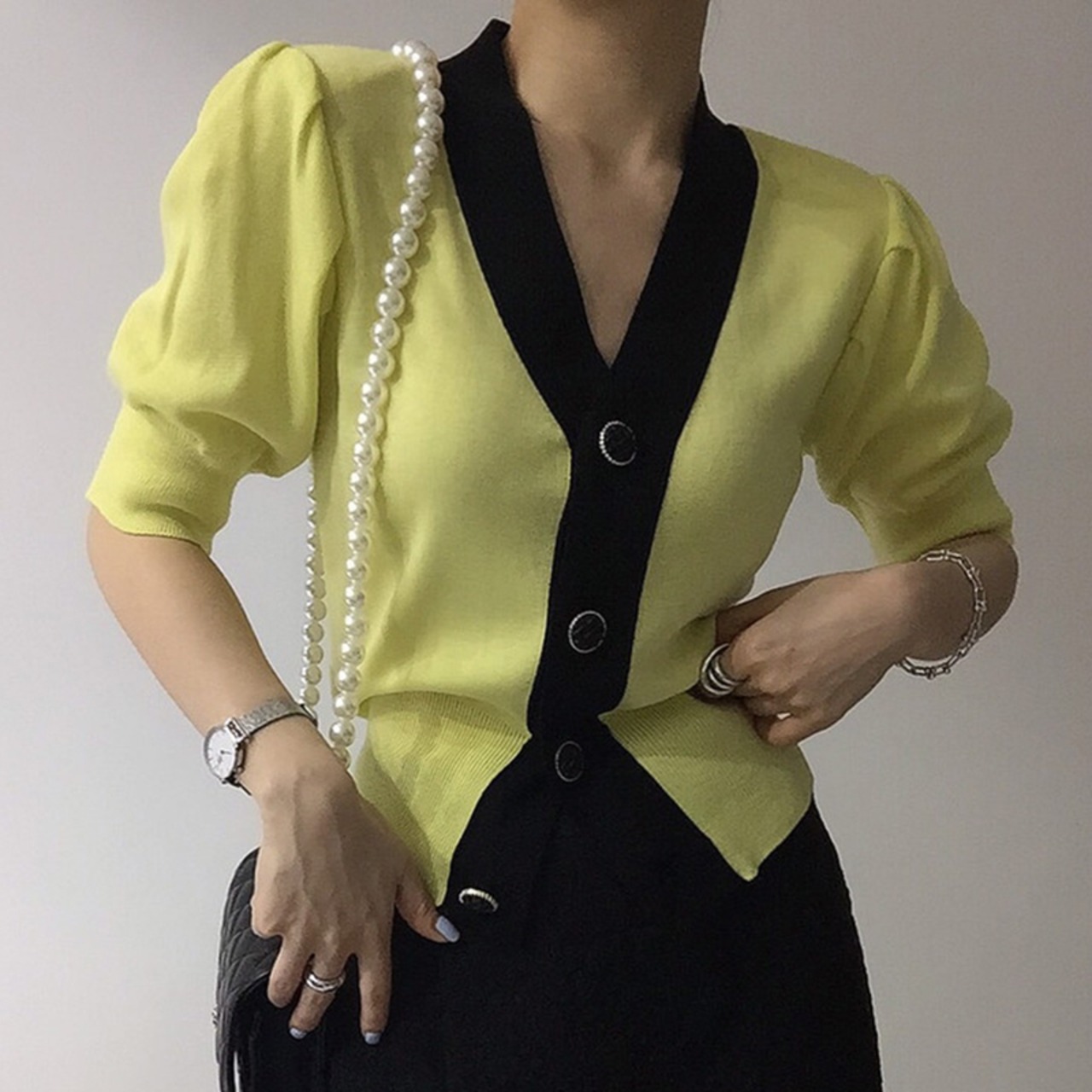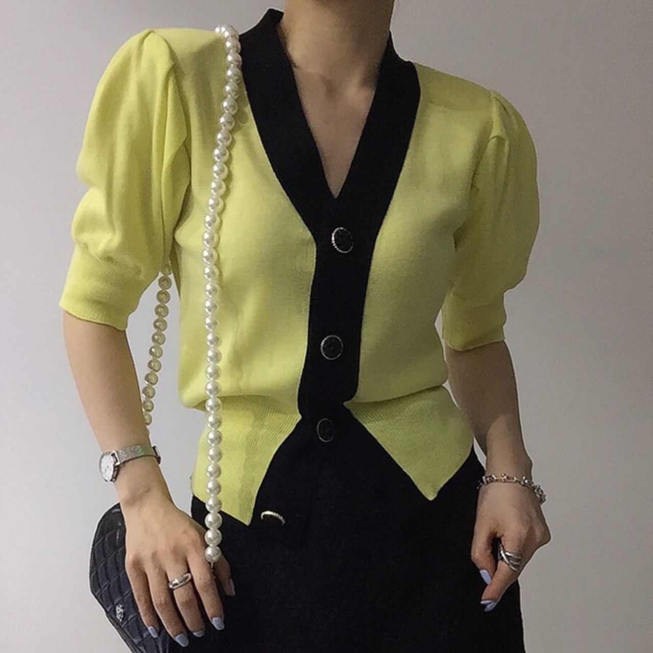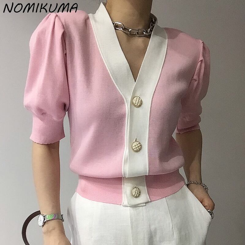 ノミクマニットスリムウエストショートセーターコートヒットカラーシングルブレストVネックニット2022サマーニットカーディガン 夏物 kor29754097661