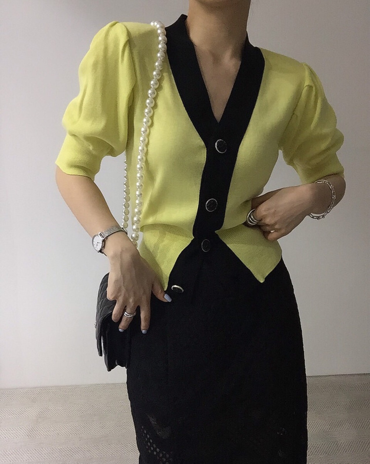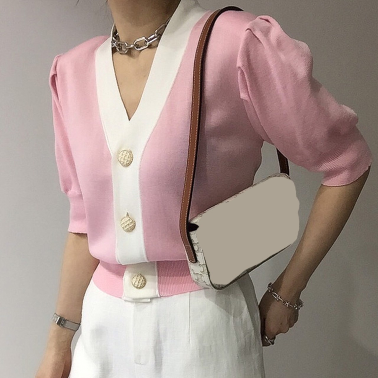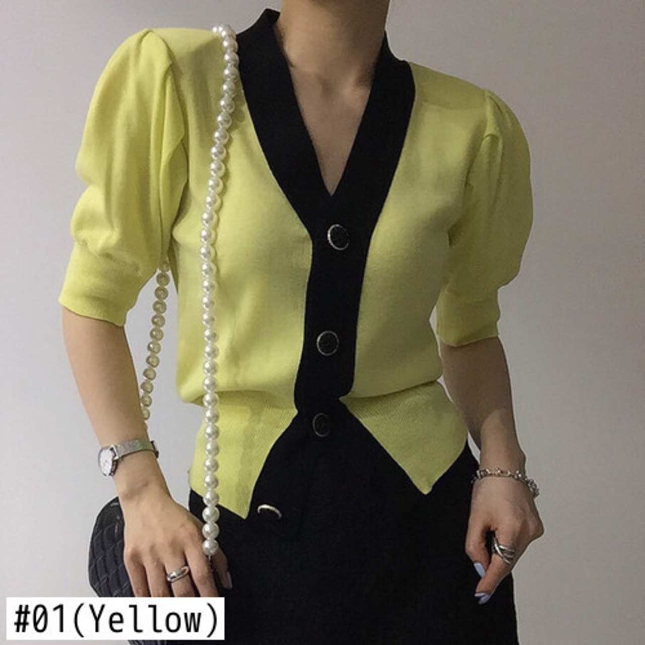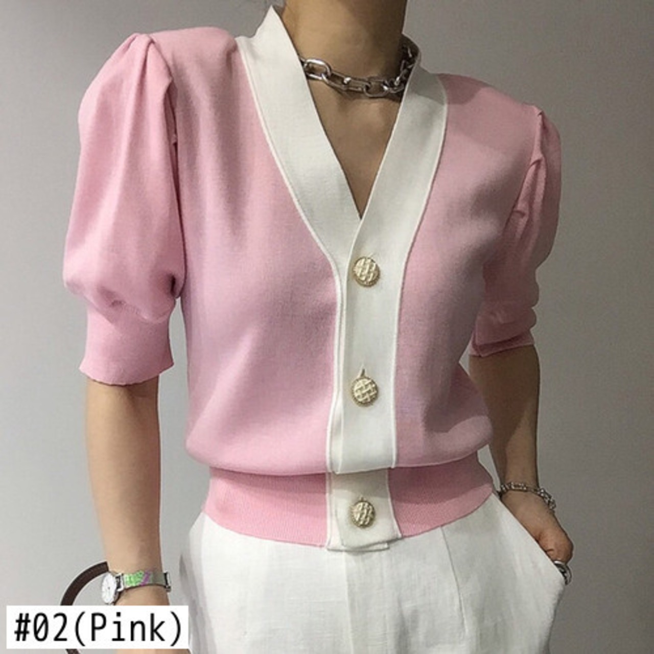 ノミクマニットスリムウエストショートセーターコートヒットカラーシングルブレストVネックニット2022サマーニットカーディガン 夏物 kor29754097661