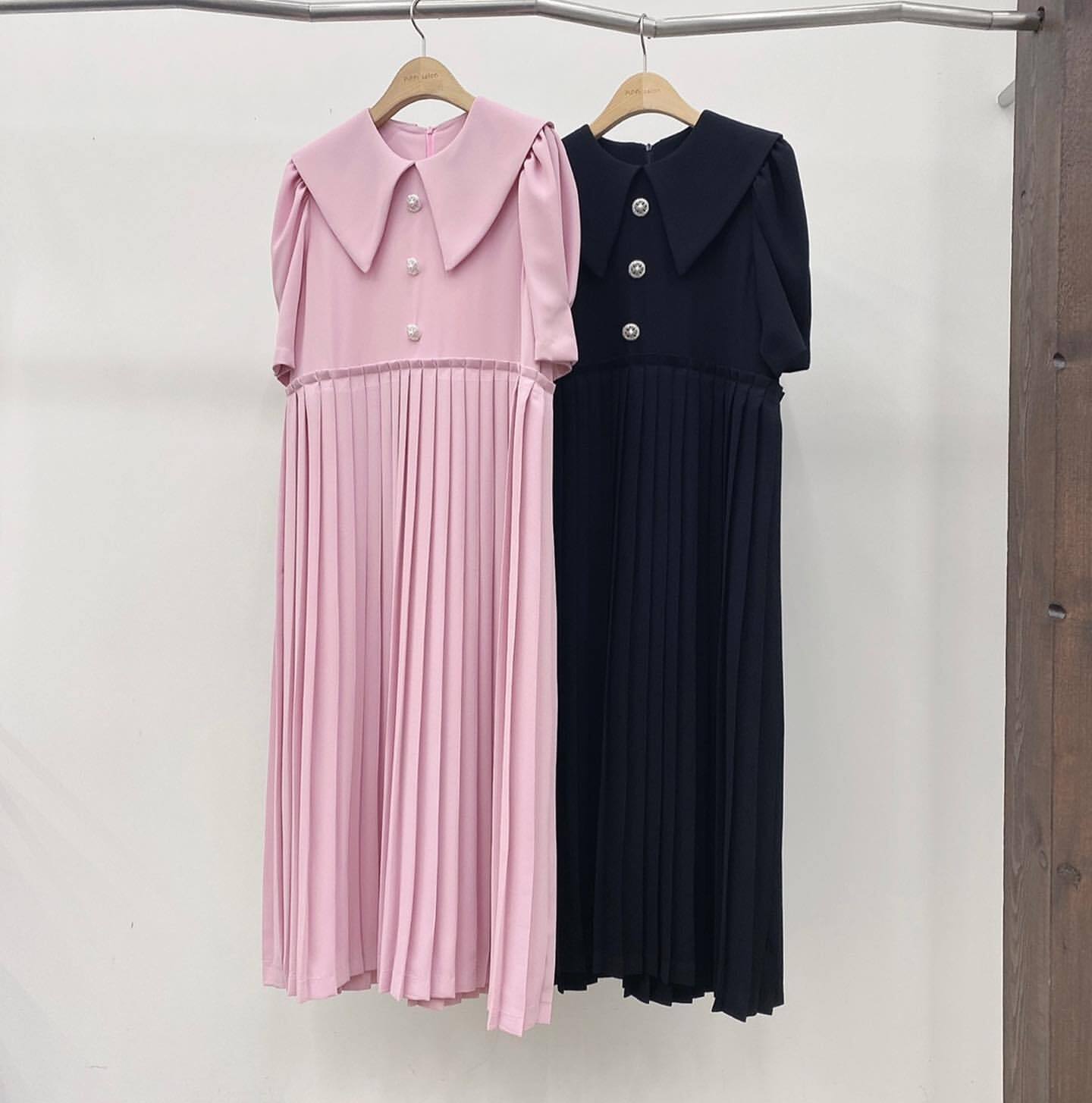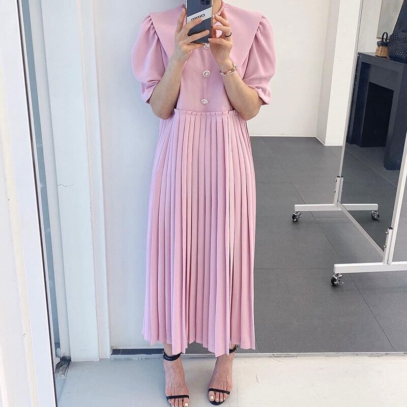 サマーウーマンドレスターンダウンカラーパフスリーブVestidosCausalAラインプリーツドレス 夏物 kor92052126371