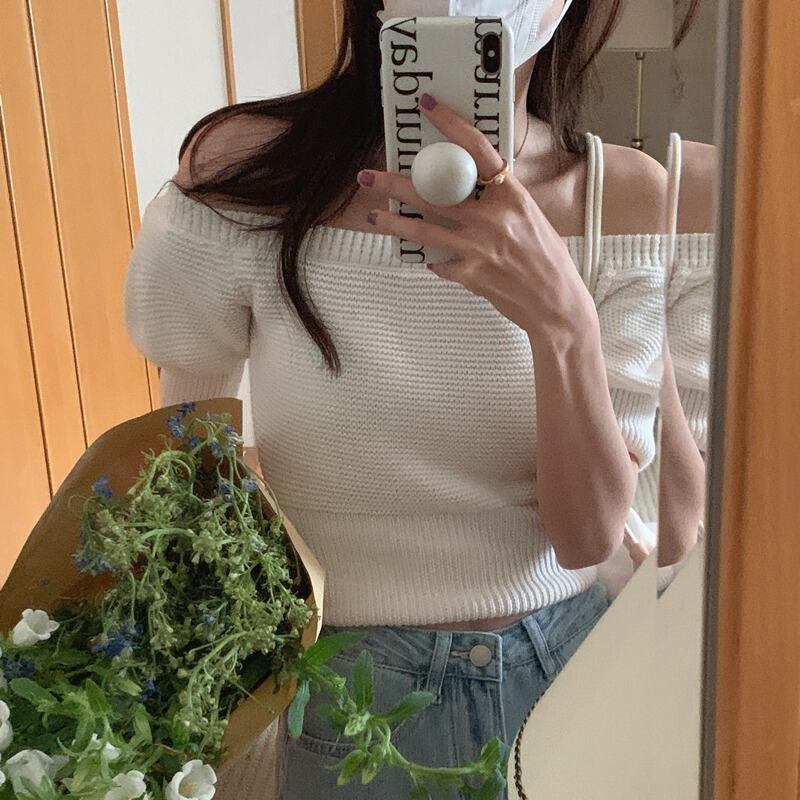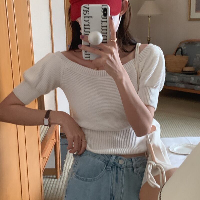 のみくまシックパフスリーブEoffショルダーニットセーター女性2022年夏プルオーバーニットカジュアルソリッドショートニットトップス サマー 夏物 オフショルダー ソリッドカラー kor22746075177