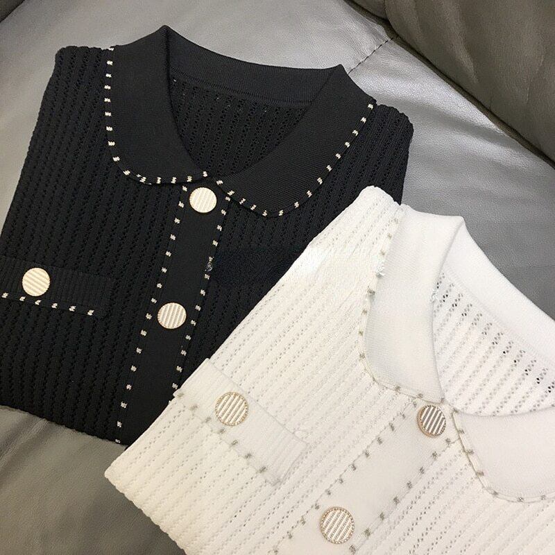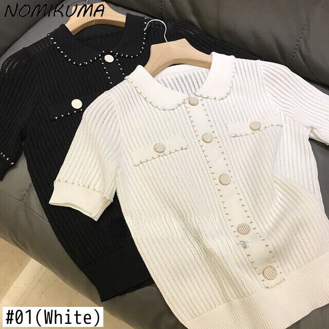 ノミクマターンダウンカラー半袖プルオーバーニット2022夏の女性セーターシックなニットトップス ショート ハーフスリーブ サマー 夏物 kor86299972724
