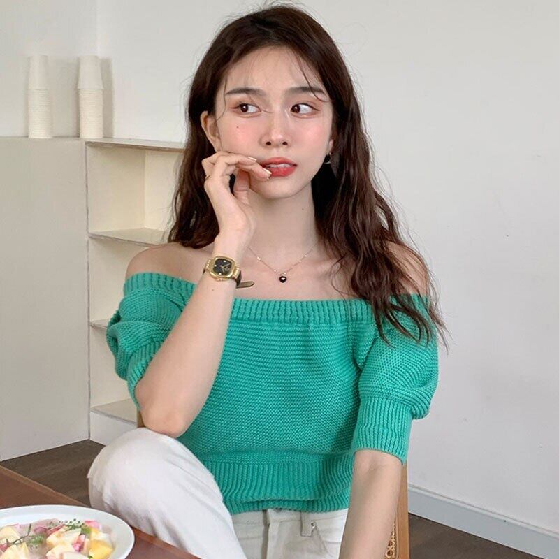 ノミクマオフショルダーニットトップスシックなサマースウィートコントラストカラーセーター2022パフスリーブスリムショートニット 大人ガーリー キュート カジュアル 夏物 kor52869057105