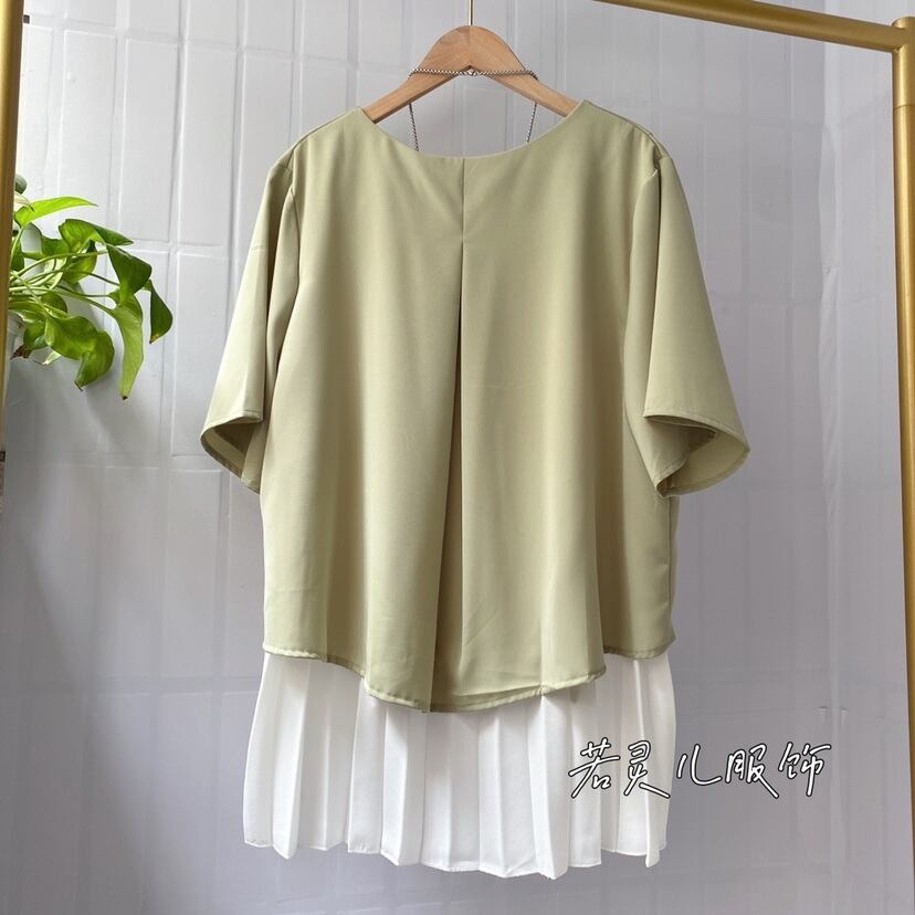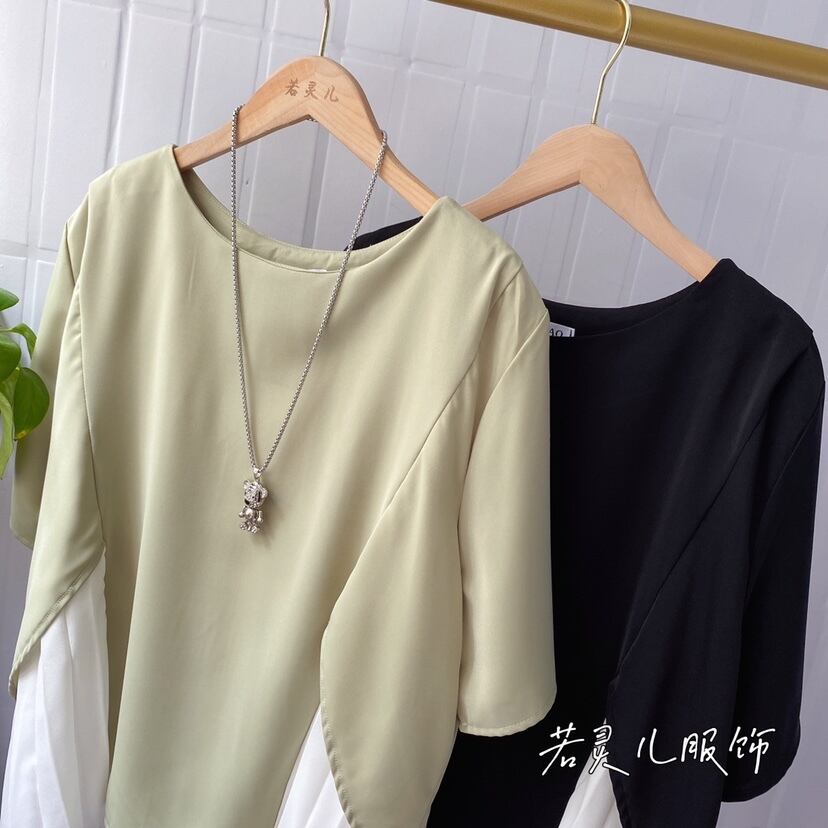 ノミクマコーザルプリーツフリルパッチワークシフォンシャツ半袖Oネックレディーストップ2022サマーヒットカラーブルーサス ショート ハーフスリーブ 夏物 kor68672035201