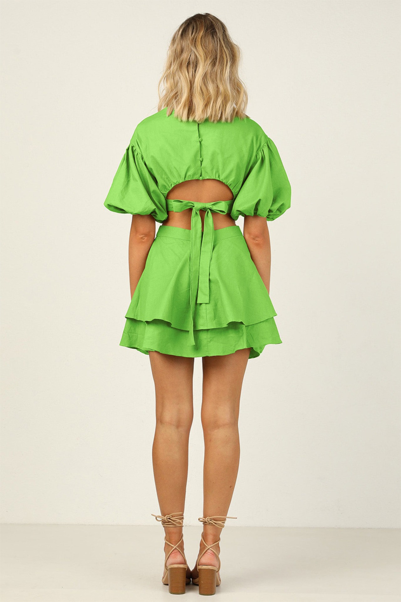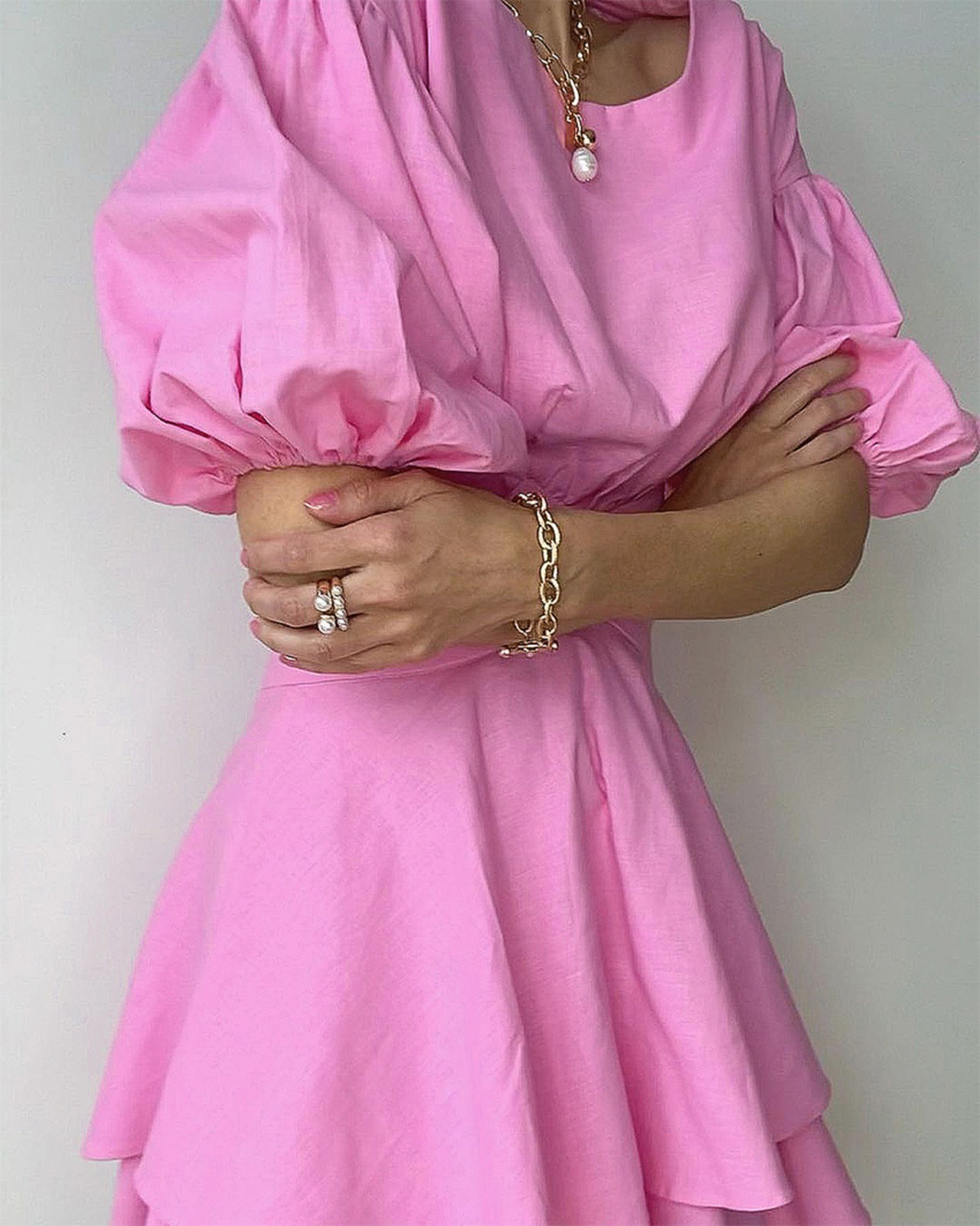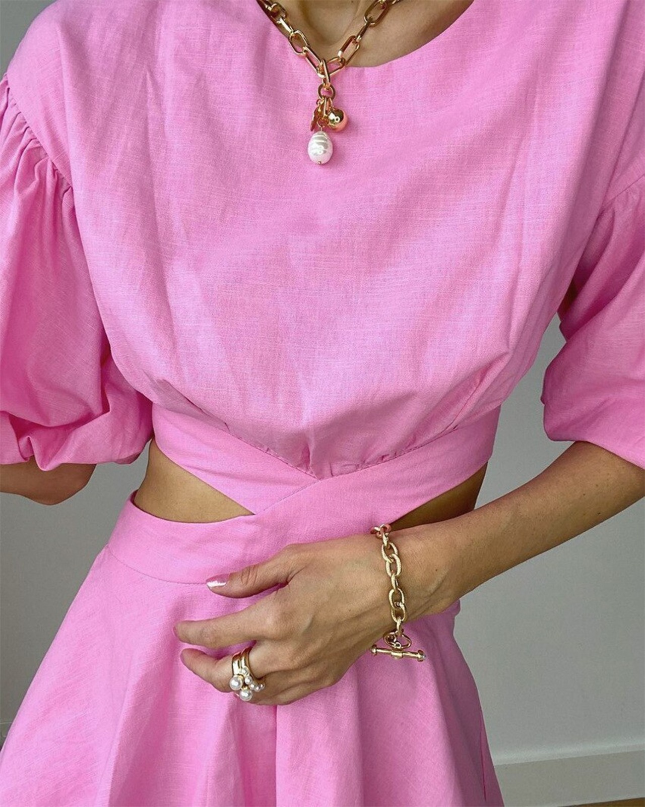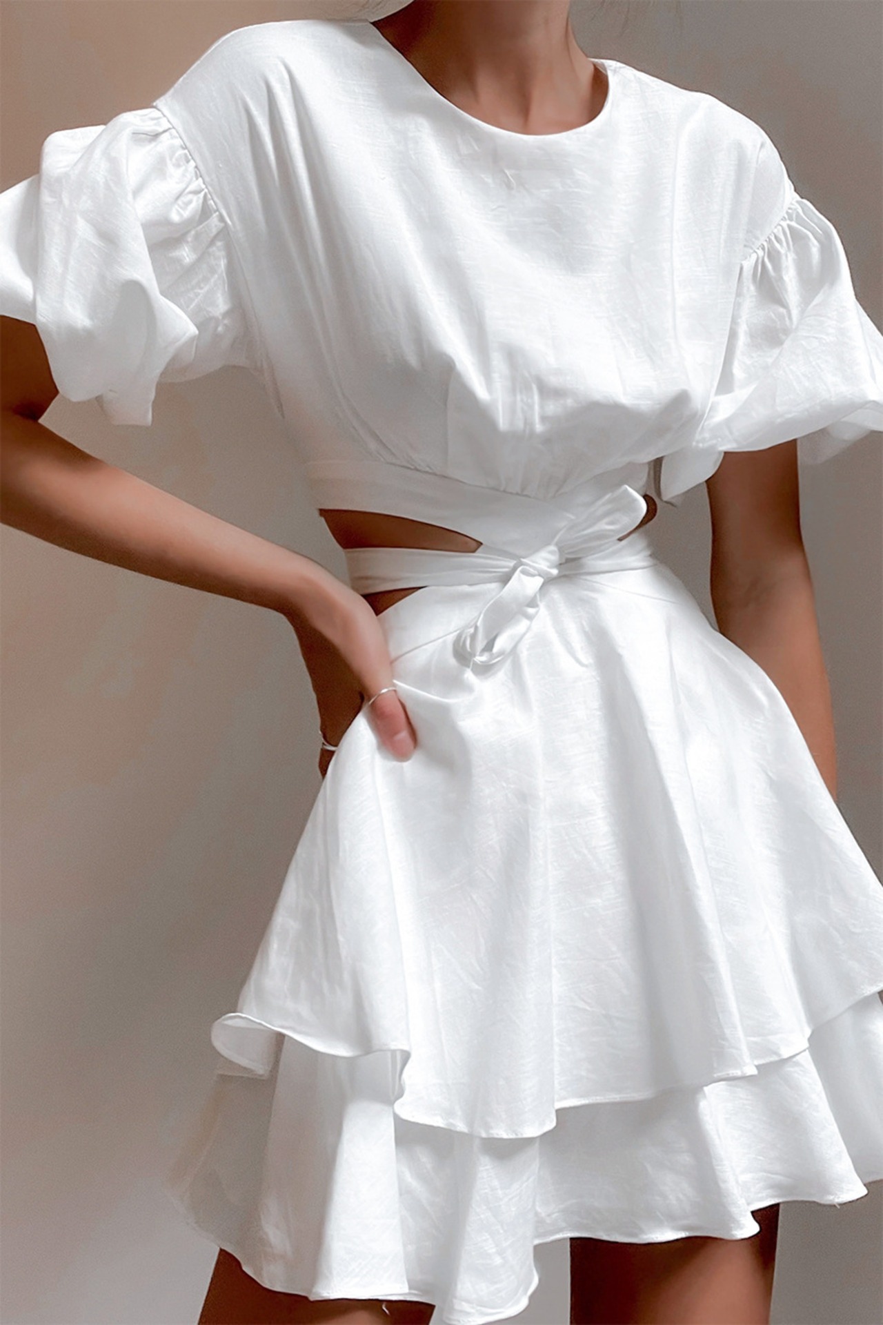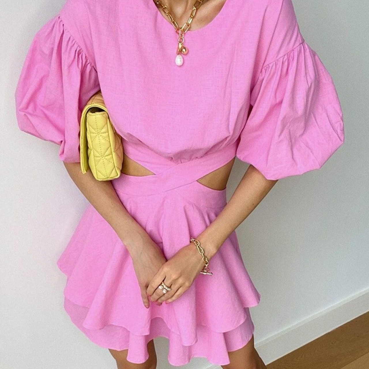 サマーホローアウトスリムウエストウーマンドレスシックなパフスリーブOネックVestidoCausalRuffleAラインドレス 夏物 kor84590921981