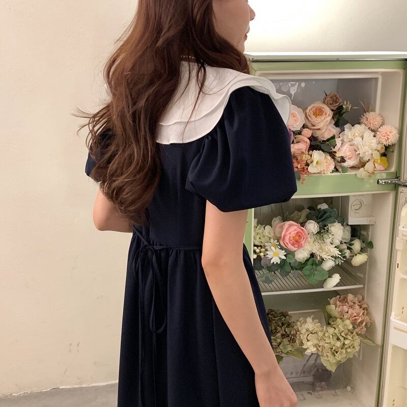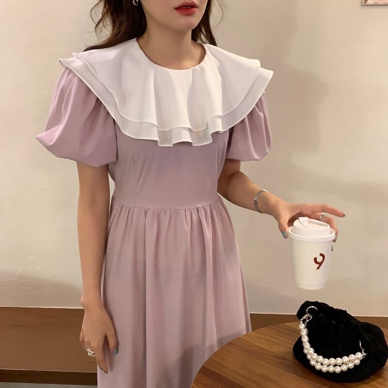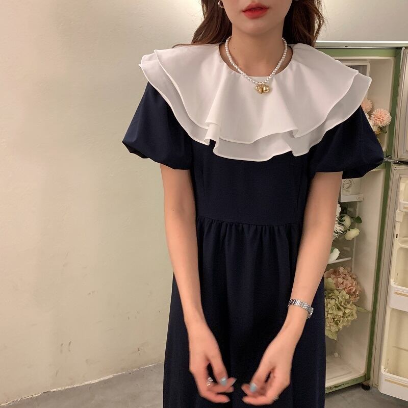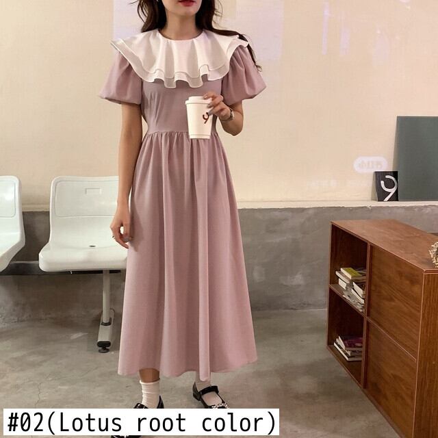 ノミクマ2022サマーウーマンドレスヒットカラーダブルフリルターンダウンカラードレスパフスリーブスリムウエストヴェスティドス 夏物 kor13818909598