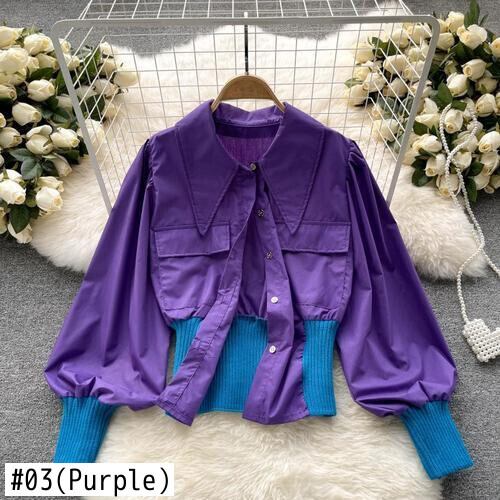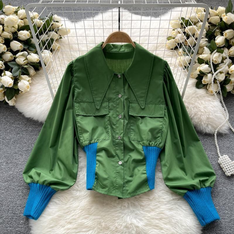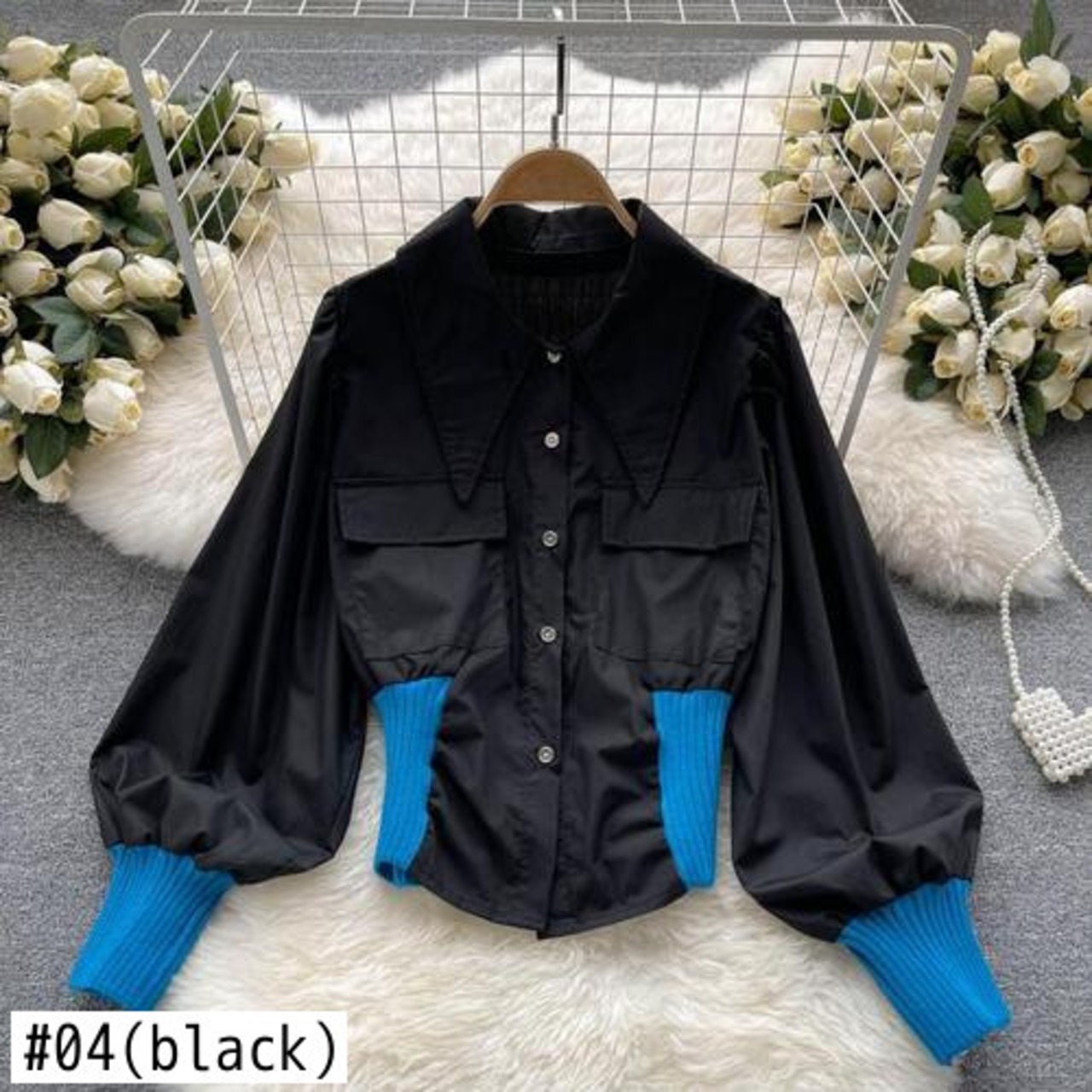 ノミクマコントラストカラースリムウエストトップスランタンスリーブターンダウンカラーブラウスシャツ2021オータムブルーサ6Z727 秋物 kor9053108879