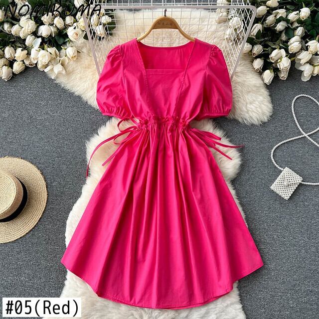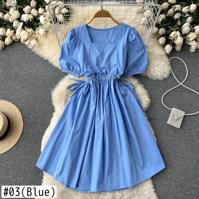 サマースクエアカラーパフスリーブドレスドローストリングスリムウエストVestidosAラインドレス 夏物 スクウェア kor37846469415