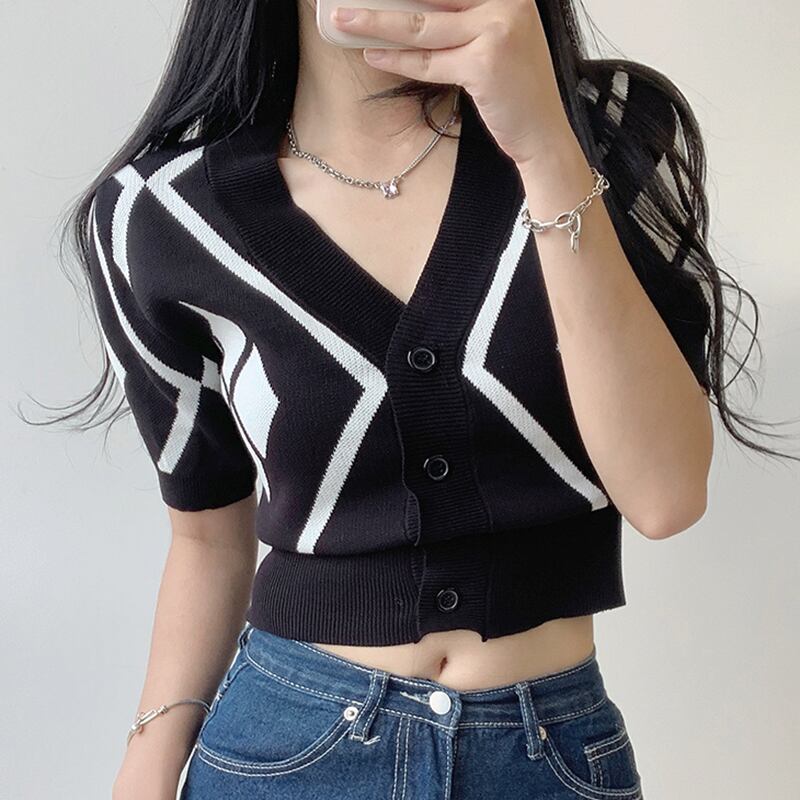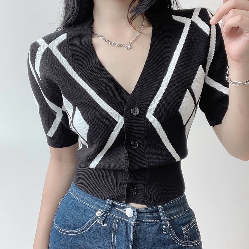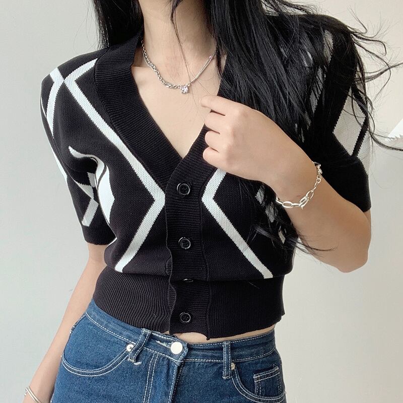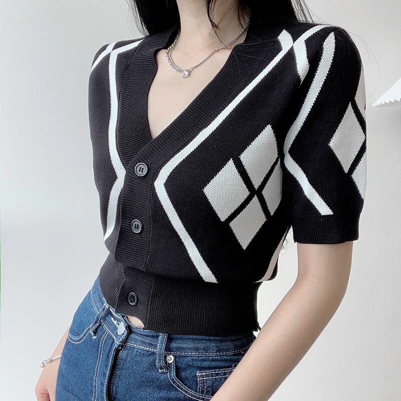 ノミクマヒットカラーアーガイルセーターコートパフスリーブVネックレディースカーディガン2022サマースリムショートニットトップ 夏物 kor59358946539