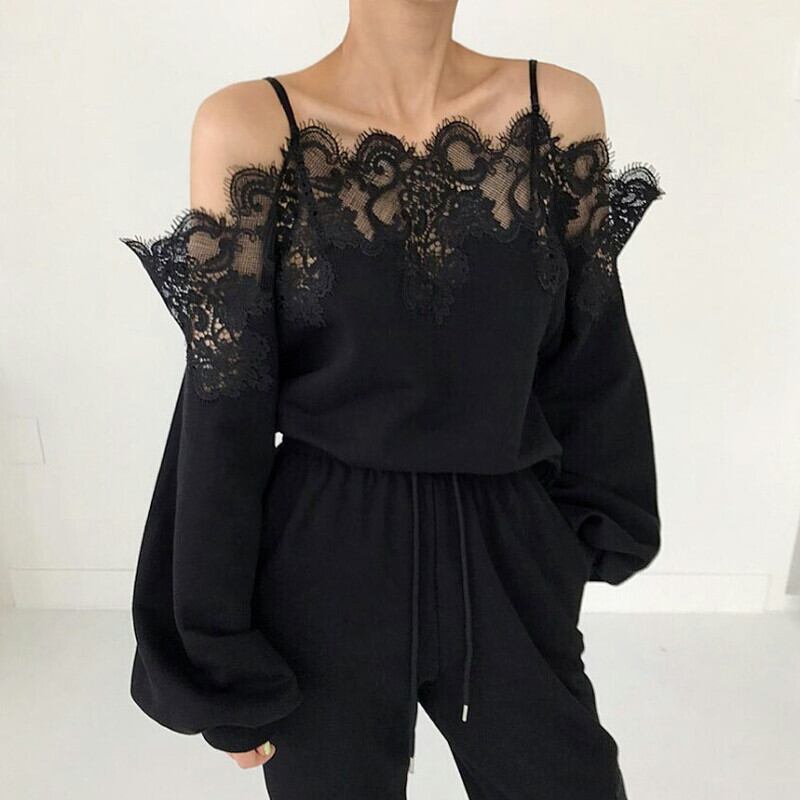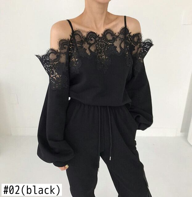 ノミクマ2021レディーススウェットシャツ刺繡レースパッチワークオフショルダースリングパーカー因果長袖プルオーバー6X651 ロング 刺繍 kor68004822035