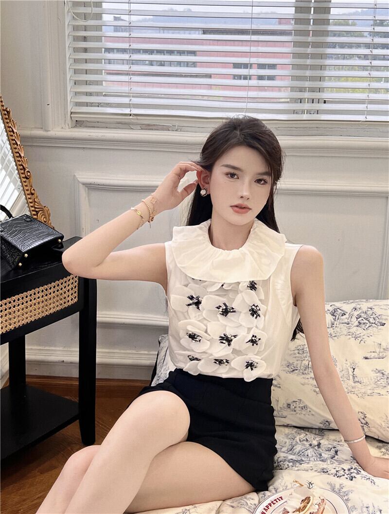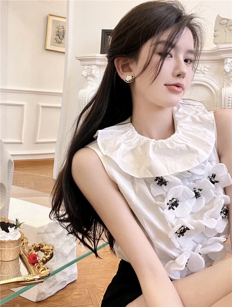 のみくまスウィートフリルOネックレディーストップスシックな3Dフラワープルオーバーカジュアルノースリーブ2022サマーベスト 大人ガーリー キュート 夏物 フラワーデザイン kor37048659269