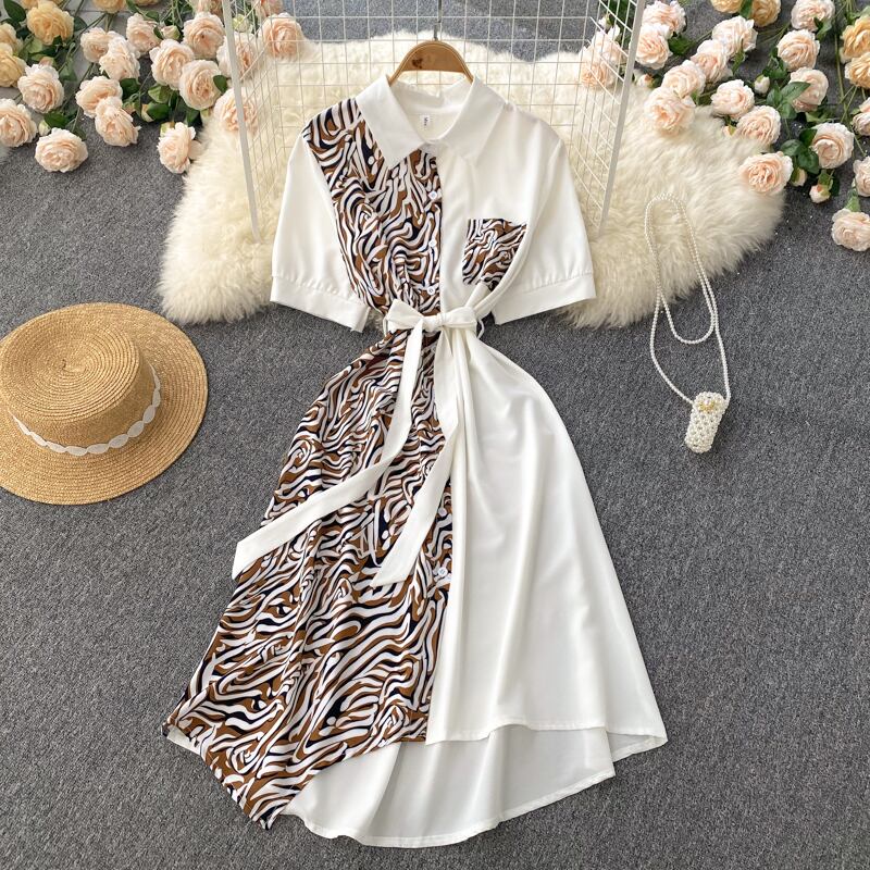 夏の女性のブラウスドレス不規則なプリント半袖Vestidosシングルブレスト包帯スリムウエストドレス ショート ハーフスリーブ サマー 夏物 kor10922142279