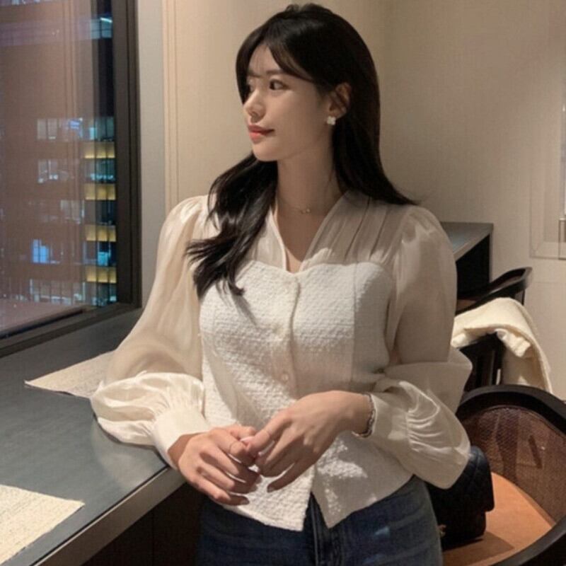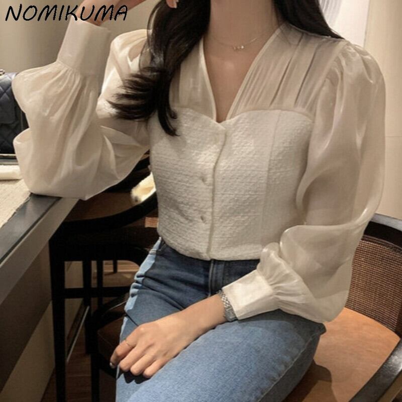 ノミクマシック秋冬ブラウスヒットカラーパッチワークVネックパフスリーブシャツ20226N760 オータム 秋物 ウィンター 冬物 kor38723879250