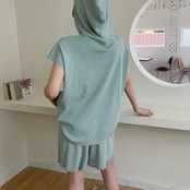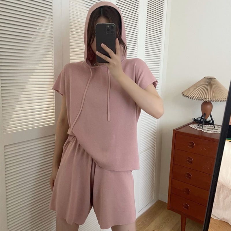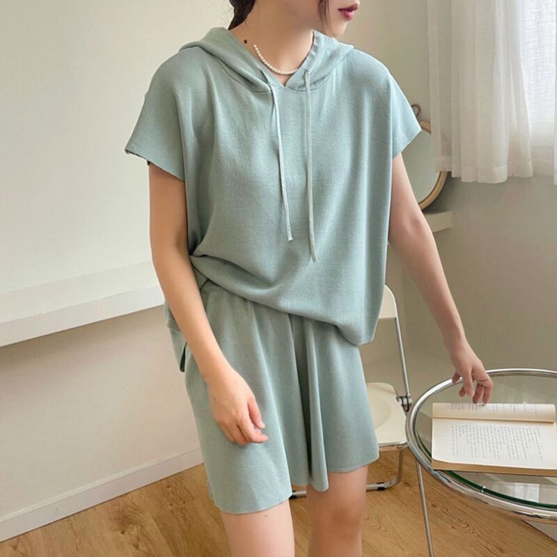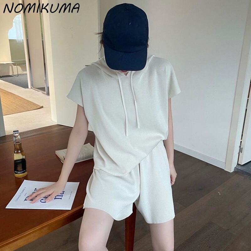 ノミクマ2022サマーツーピースセットカジュアル半袖フード付きプルオーバートップ+レースアップウエストワイドレッグショーツスーツ ショート ハーフスリーブ 夏物 ブルマー ワイドパンツ kor40390526175