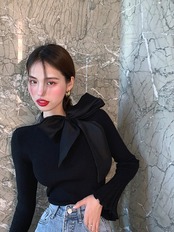 ノミクマスウィートボウネクタイカラープルオーバーニット2020オータムフレアロングスリーブニットトップススリムベーシックレディースセーター6C872 リボン 長袖 大人ガーリー キュート カジュアル 秋物 kor19192544301
