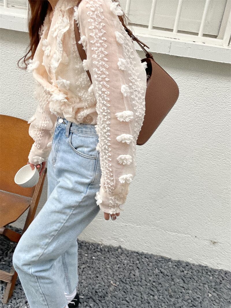 のみくまシック3Dフラワーレディースシャツカジュアルガーゼパフスリーブブラウストップス2022春ターンダウンカラー スプリング 春物 フラワーデザイン kor70001180609
