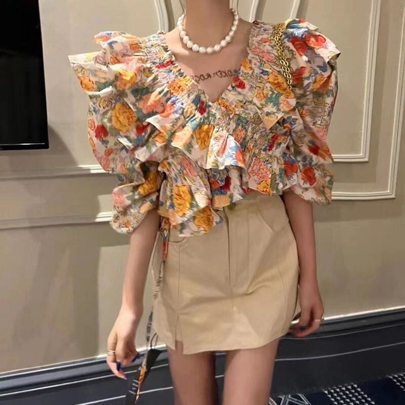 ノミクマシックフリルフローラルシャツ2022サマーハーフパフスリーブVネックブラウストップスレディースショート 夏物 花柄 kor71179977737