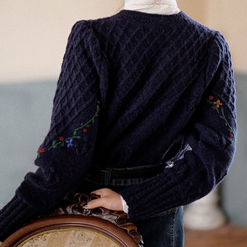 のみくま刺繡フックシンテージセーターコート2021秋冬ニットカーディガンパフスリーブVネックニット6X125 刺繍 オータム 秋物 ウィンター 冬物 kor65782338348