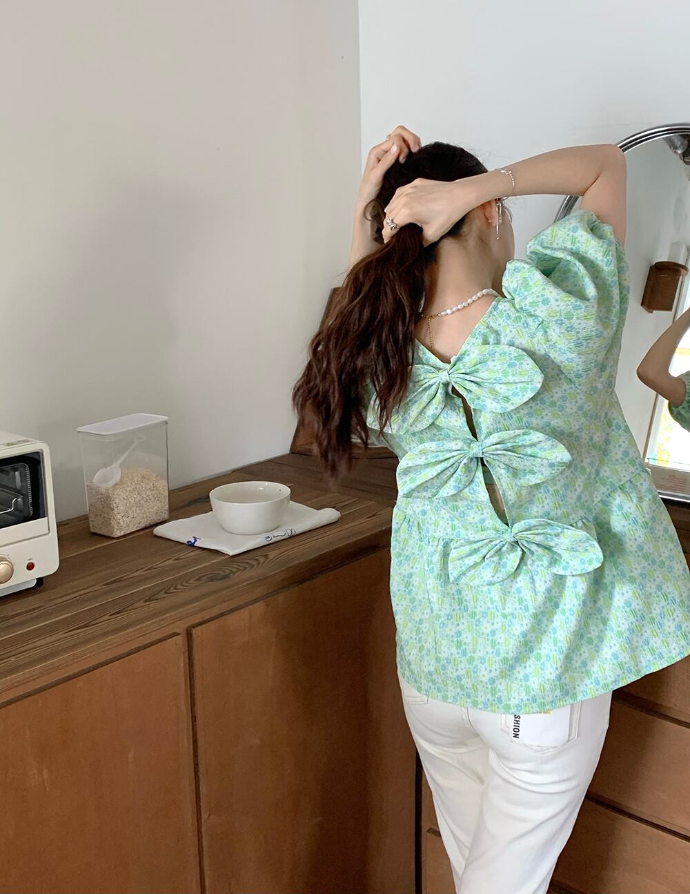 のみくまシックスウィートフローラルシャツバックボウノットカジュアルパフスリーブブラウストップス2022SummerModa De リボン 大人ガーリー キュート サマー 夏物 花柄 kor12175916803