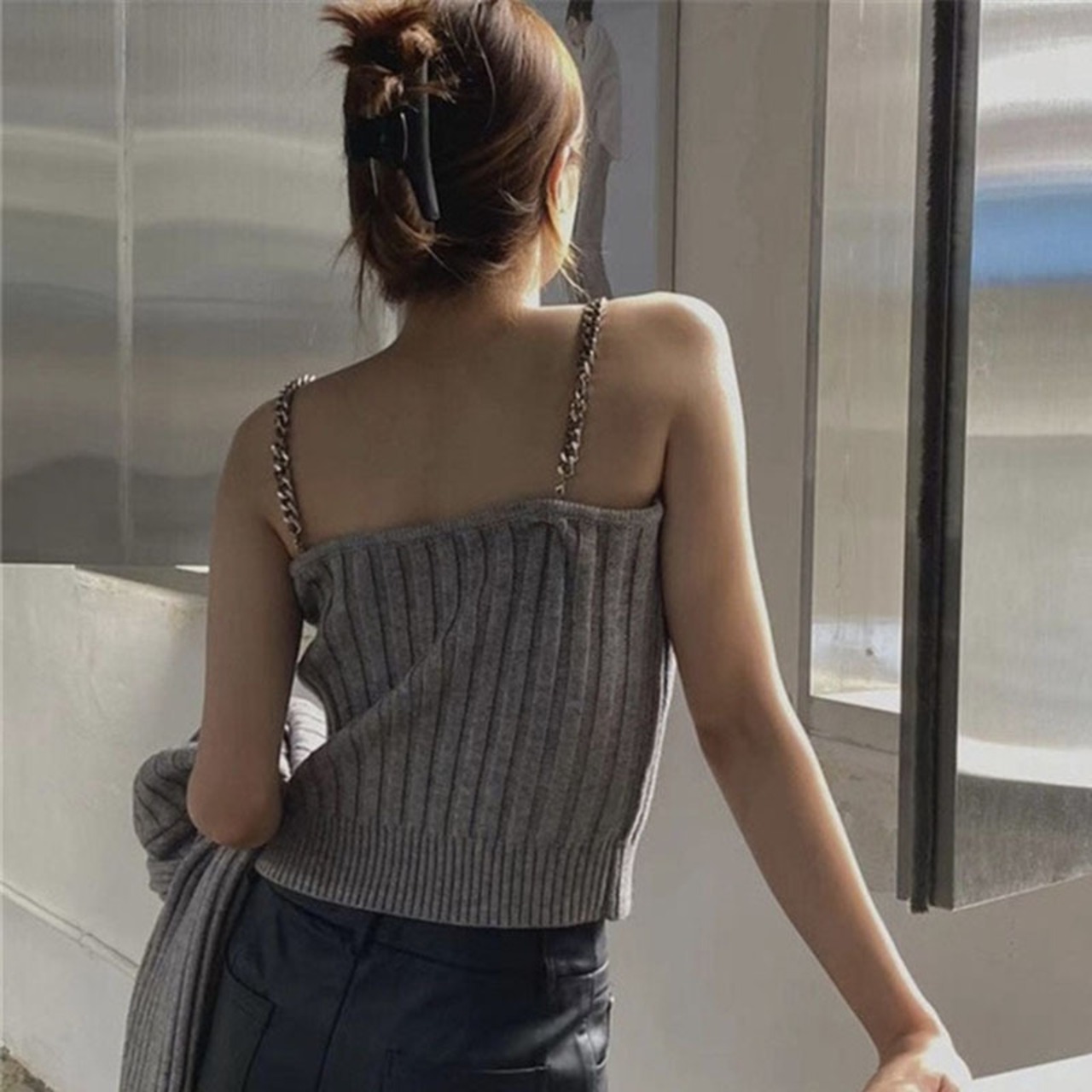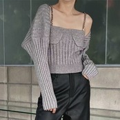 ノミクマレディースニットツーピースセットメタルチェーンニットスリングベスト+パフスリーブカジュアルセーターカーディガン2021秋6Z614 オータム 秋物 kor37598054753