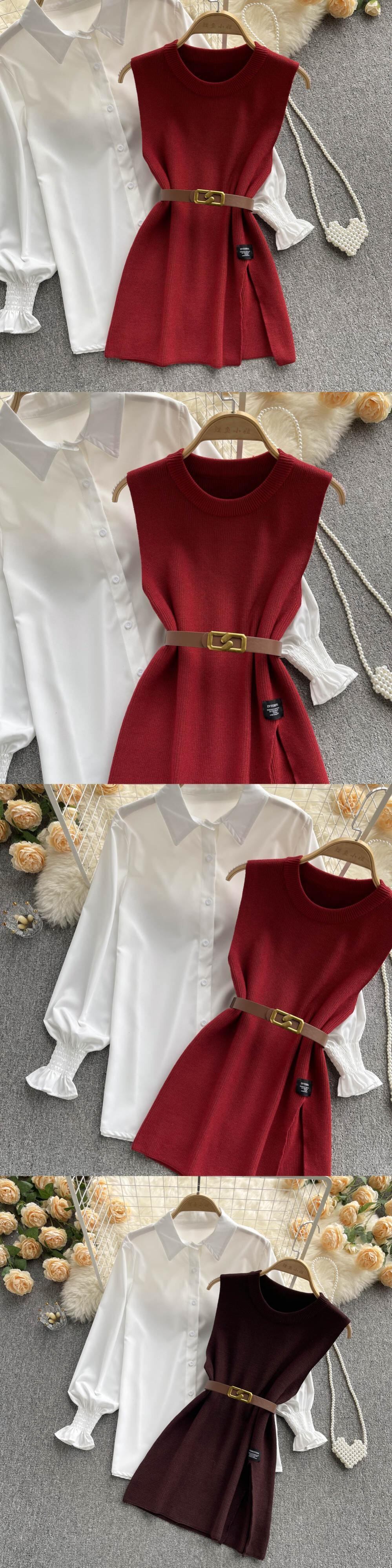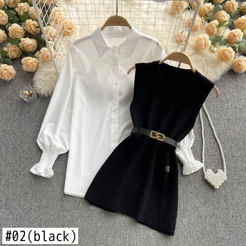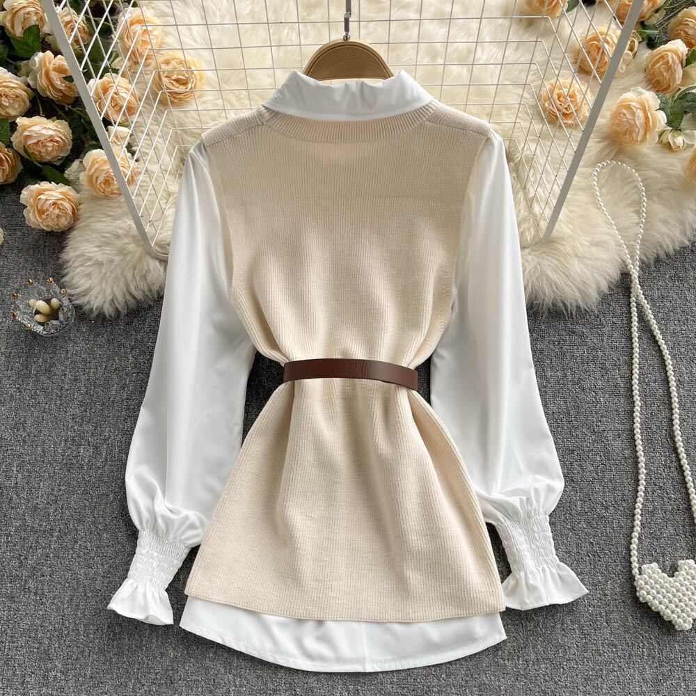 ノミクマ2ピースレディーストップセット2022春長袖ベーシックブラウスシャツ+ベルトスリムウエストプルオーバーニットスプリットベスト ロング スプリング 春物 ハーネス kor79989882907