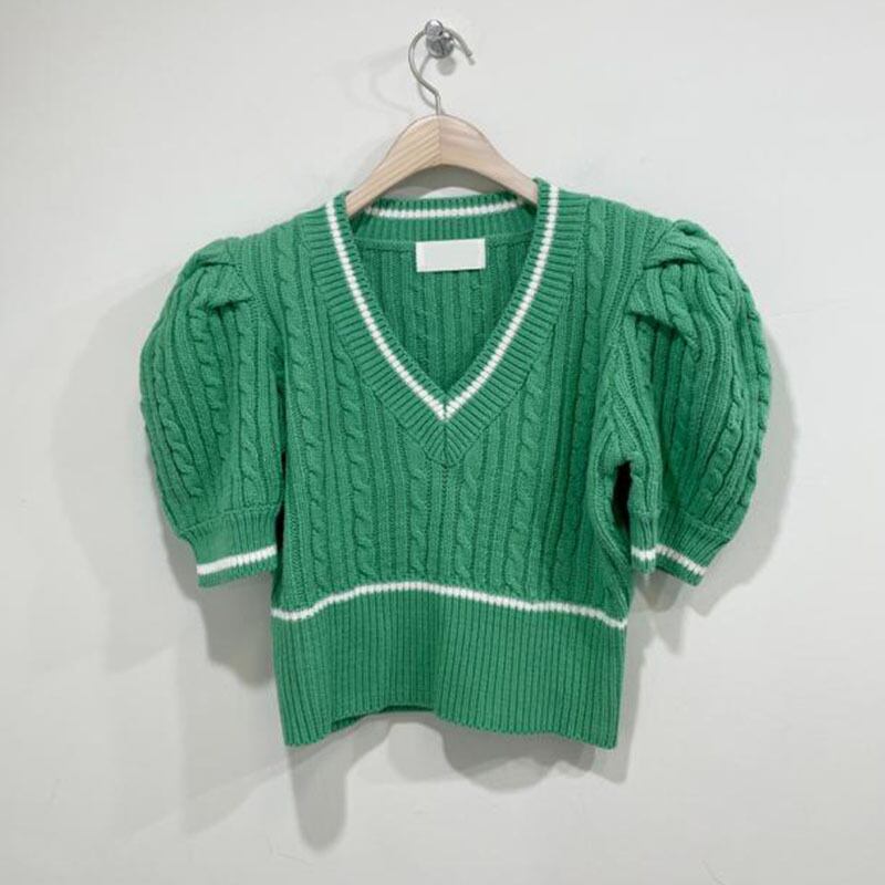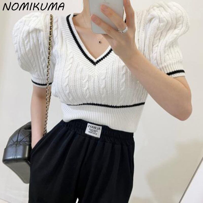 ノミクマシックヒットカラーサマーパフスリーブプルオーバーニットツイストVネックショートレディースニットセーター2022 夏物 kor50990407758