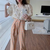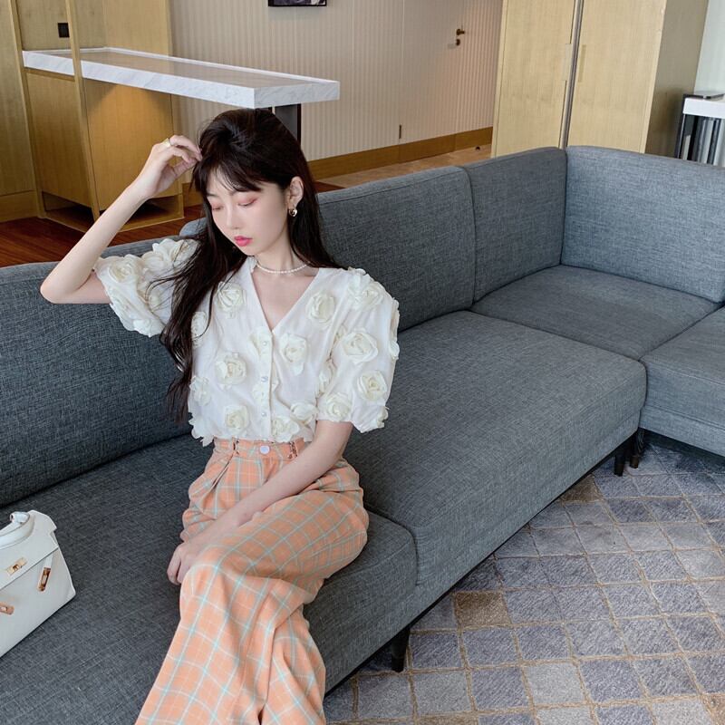 ノミクマ3DフラワーズウーマンシャツシックパフスリーブVネックブラウスシャツCausal2022Summer De Moda サマー 夏物 フラワーデザイン kor857148973
