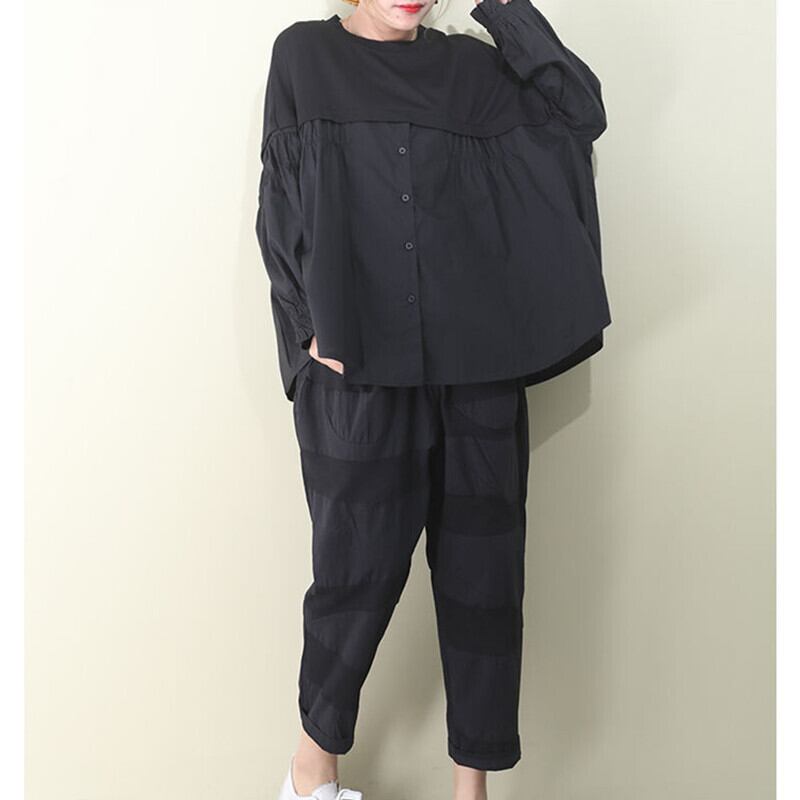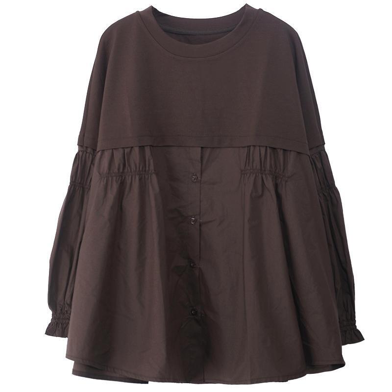 のみくまパッチワーク女性ブラウス因果長袖Oネック特大シャツ2021ボタンプルオーバートップ6E427 ロング kor81391611083