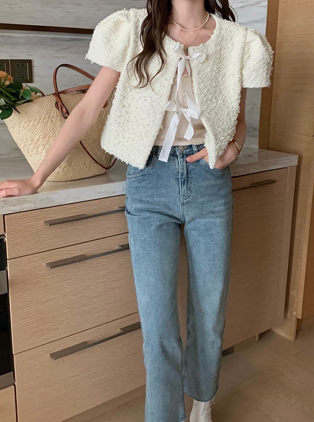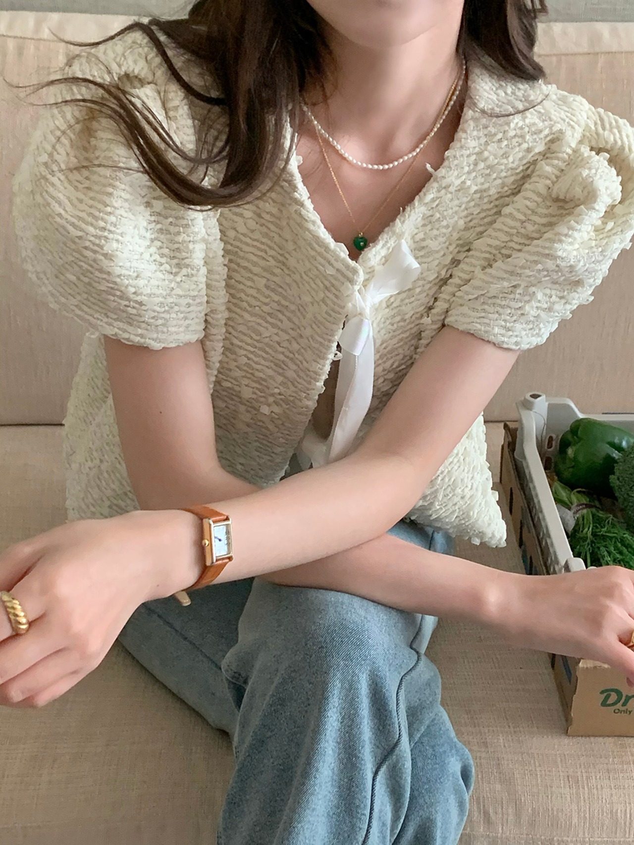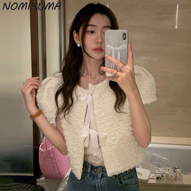 ノミクマシックサマーウィメンズカーディガンショートコートスウィートボウタイジャケット2022パフスリーブOネックアウトウェアトップス リボン 大人ガーリー キュート カジュアル 夏物 kor29522841958