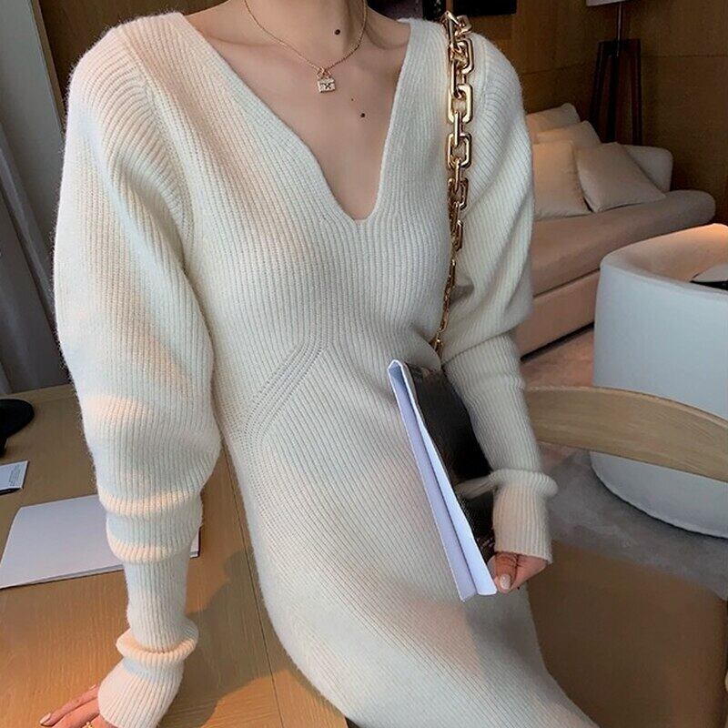 ノミクマスリムレディースセータードレス長袖Vネック年秋冬ニットワンピース6X153 ロング オータム 秋物 ウィンター 冬物 kor30283237229