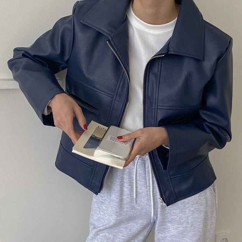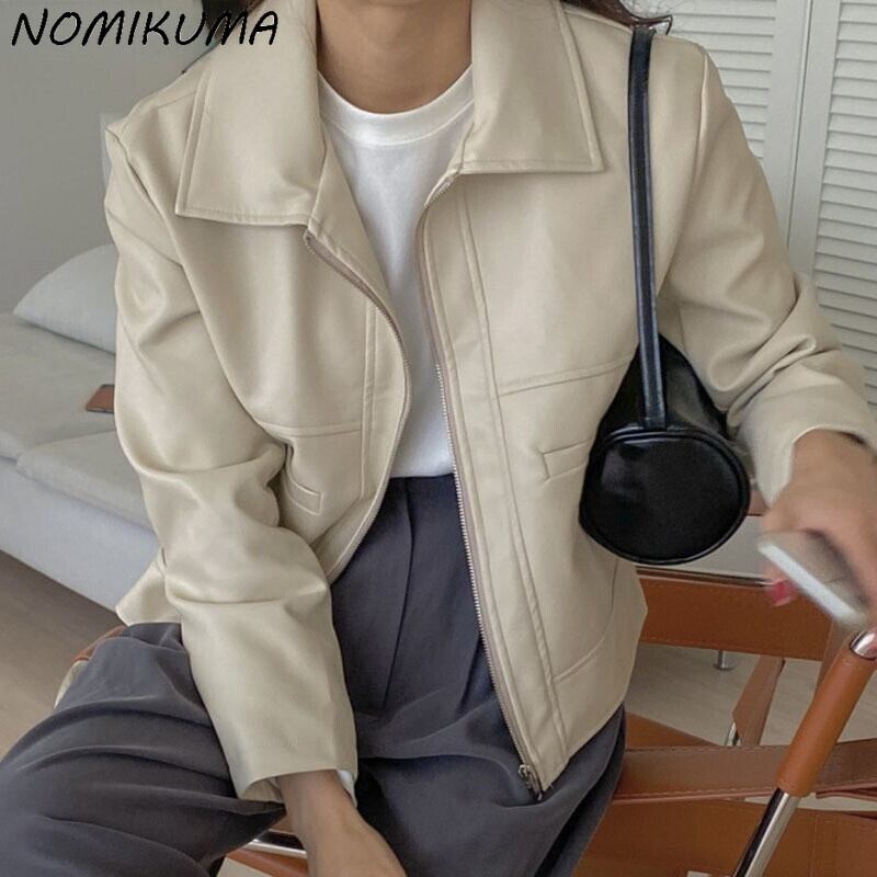 ノミクマPUレザーショートウーマンジャケットオータムジッパーターンダウンカラーモーターサイクルコート2021ショートアウトウェア6Z612 秋物 kor75070536551