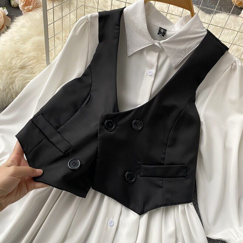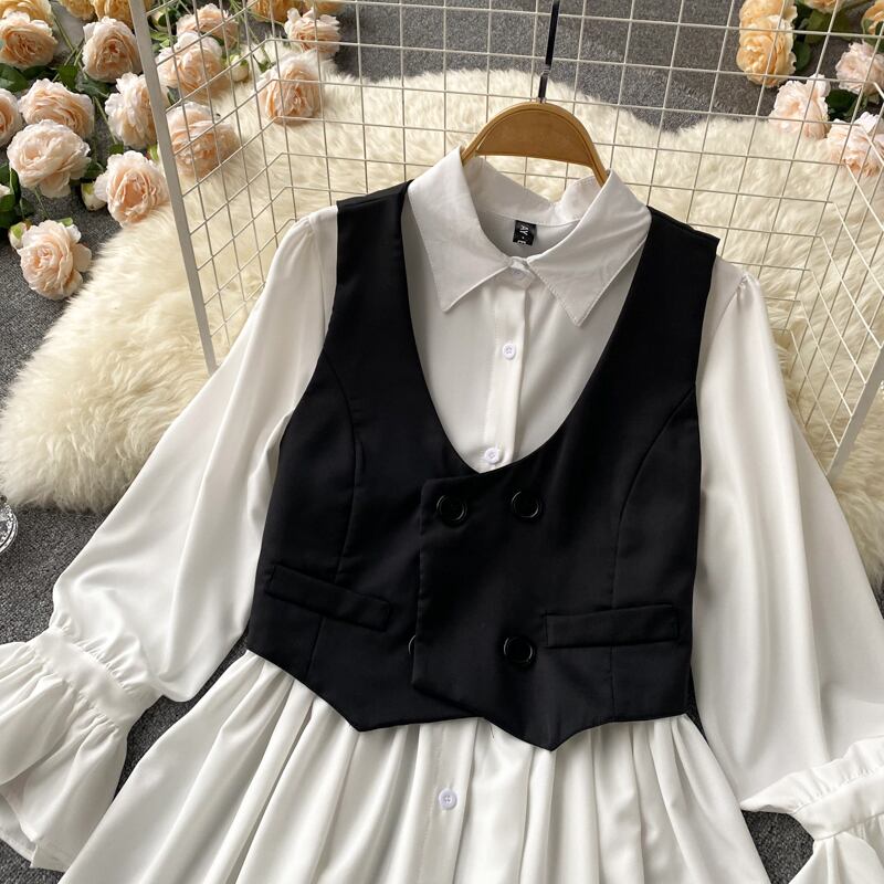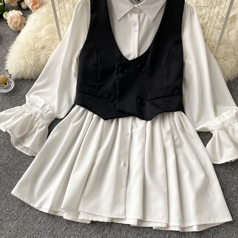 ノミクマ2022春ツーピースレディースセットフレアスリーブフォールドスウィートブラウスシャツ+ダブルブレストブレザーベストスーツ 大人ガーリー キュート カジュアル スプリング 春物 kor76996188981