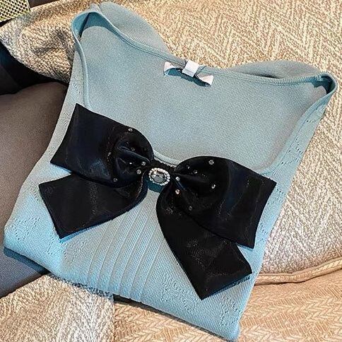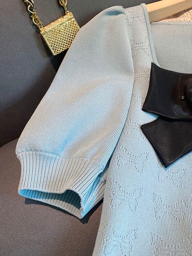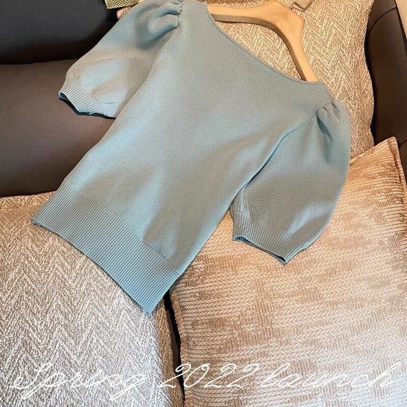 ノミクマシックスウィートボウノットスクエアカラーニット2022サマーパフスリーブセーターレディーススリムプルオーバーニットトップス リボン 大人ガーリー キュート カジュアル 夏物 スクウェア kor25044880402