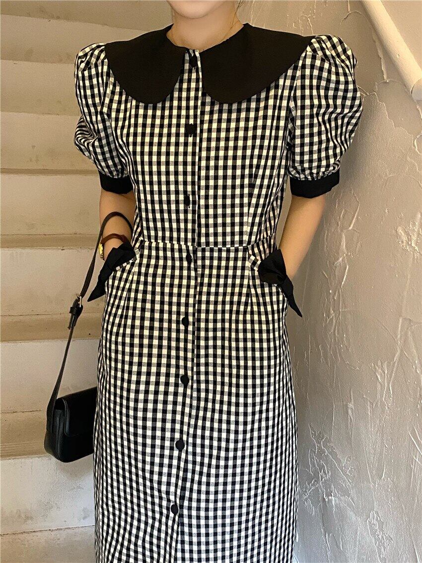 ノミクマチェック柄女性ドレスヒットカラーピーターパンカラードレスサマーシングルブレストパフスリーブVestidos 夏物 kor76945960946
