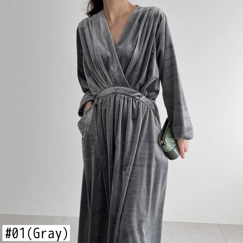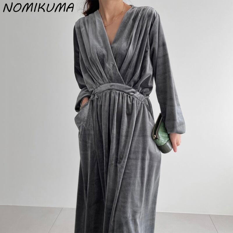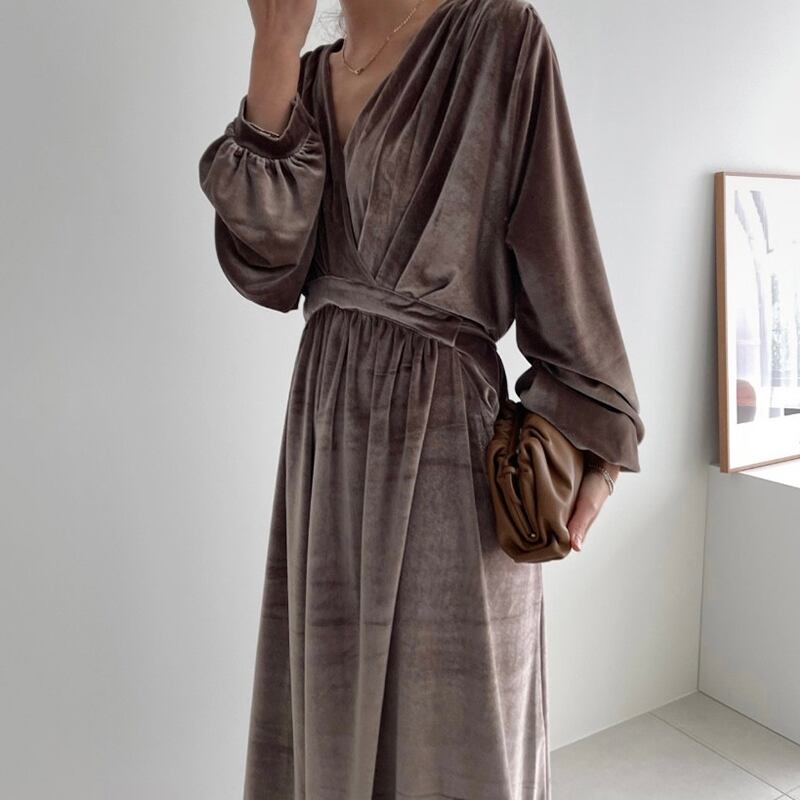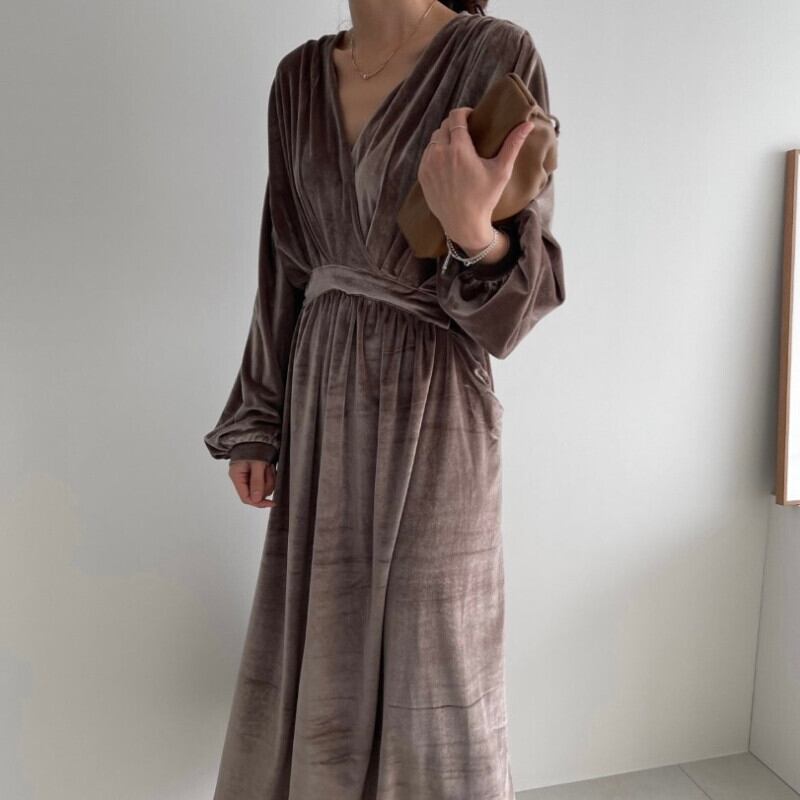 ノミクマベロアウーマンドレスドローストリングスリムウエストヴェスティドスランタンスリーブVネックワンピース6N326 kor21003301009