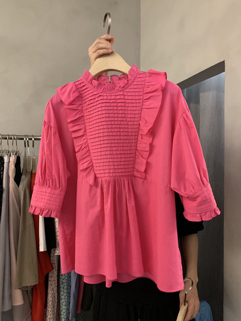 ノミクマウーマンドールシャツシックフォールドフリルパフスリーブブラウストップス2022サマースタンドエンクコーザルスウィートデモダ 大人ガーリー キュート カジュアル 夏物 kor5073472779