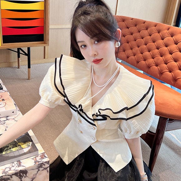 のみくまシックダブルフリルピーターパンコラーブラウストップスダブルブレストスリムウーマンシャツサマーパフスリーブ 夏物 kor35008917777