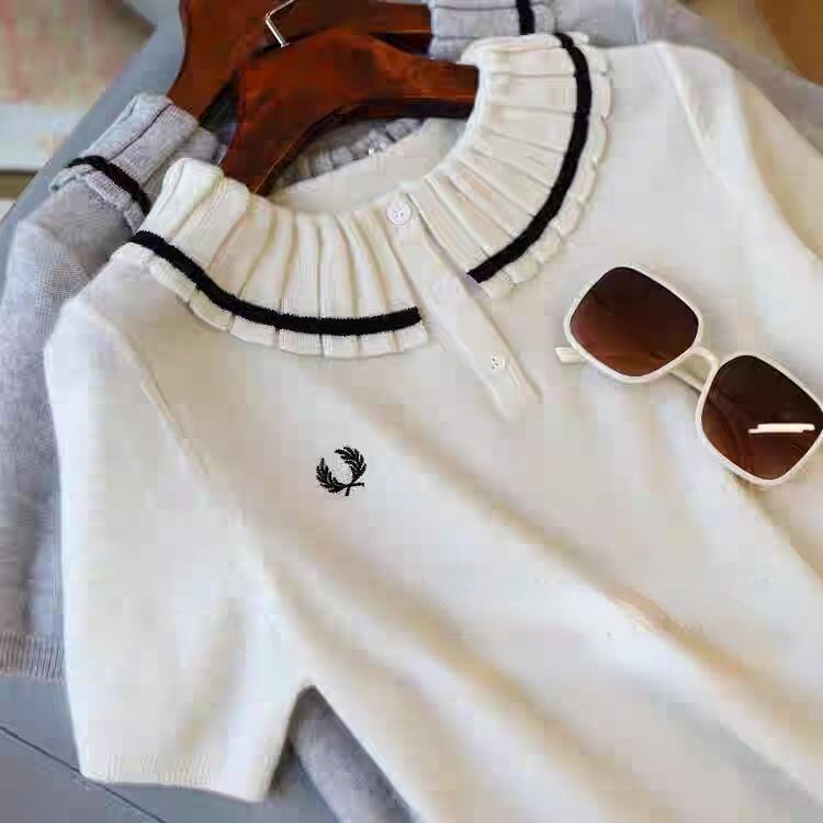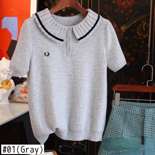 ノミクマ2022セータースウィートフォールドピーターパンカラーニット半袖シックな刺繡レディースニットトップス ショート ハーフスリーブ 刺繍 大人ガーリー キュート カジュアル kor62633378494