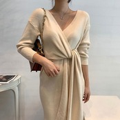 ノミクマレディースセータードレスレースアップスリムウエストワンピース長袖Vネック秋冬ニット ロング オータム 秋物 ウィンター 冬物 kor341249741