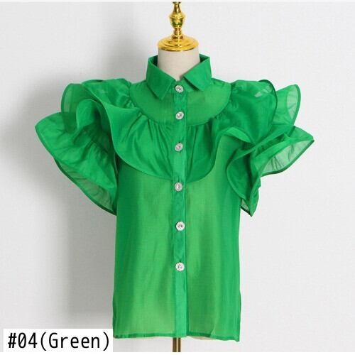 ノミクマ2022フリルフライングスリーブレディースブラウスターンダウンカラーシャツCausalSolidFeminimos ソリッドカラー kor83736699682