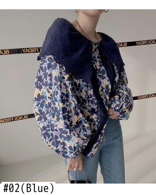 のみくまフックレースパッチワークターンダウンカラーブラウストップカジュアルランタンスリーブフローラルシャツレディース2022春 スプリング 春物 花柄 kor26682044466